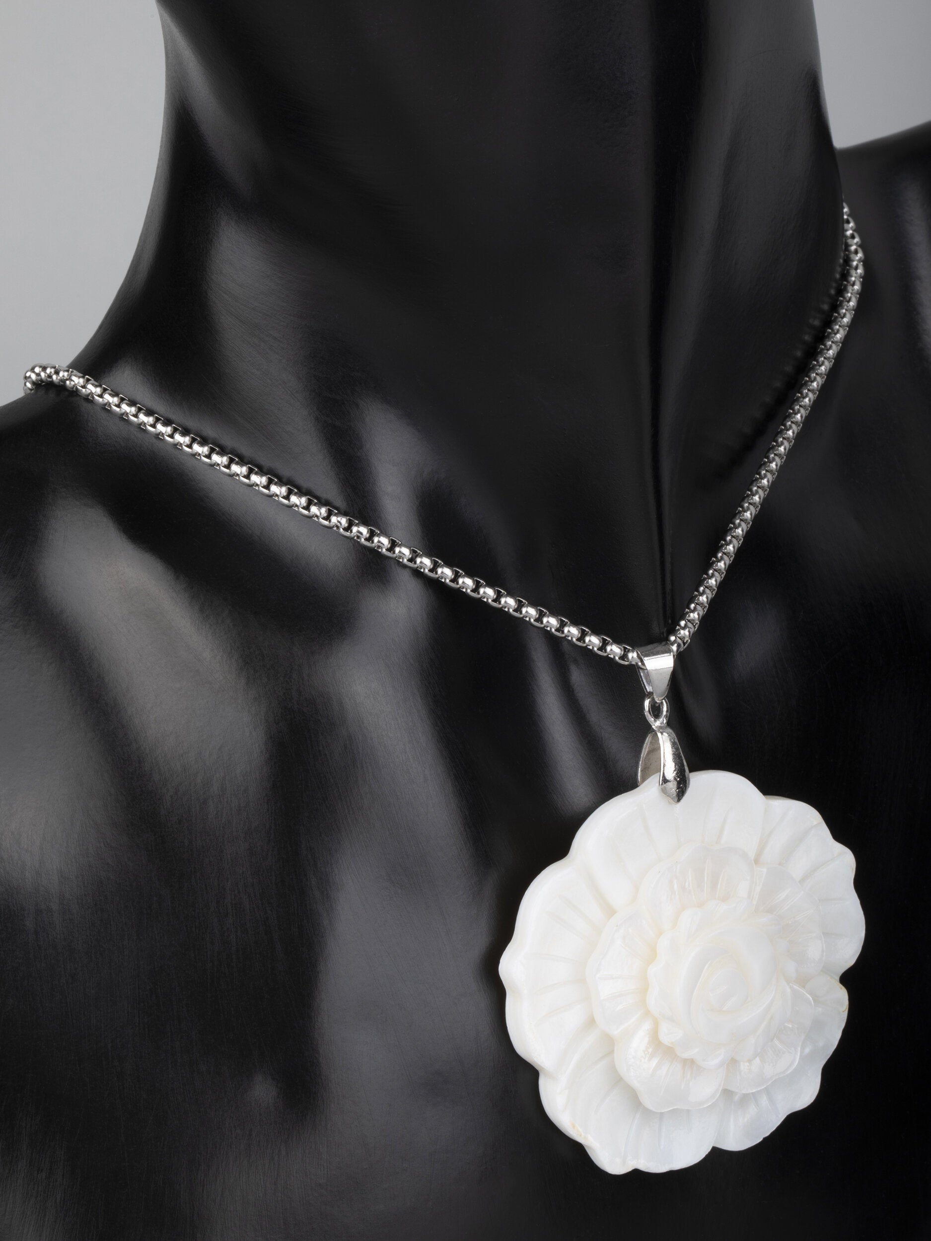 Krásný přívěsek ve tvaru růžičky z přírodní Paua mušle. Tento materiál se považuje za nejbarevnější perleť na světě, neboť opalizuje duhovým efektem. Přívěsek je jemné bílé barvy, která se krásně hodí ke každému outfitu.