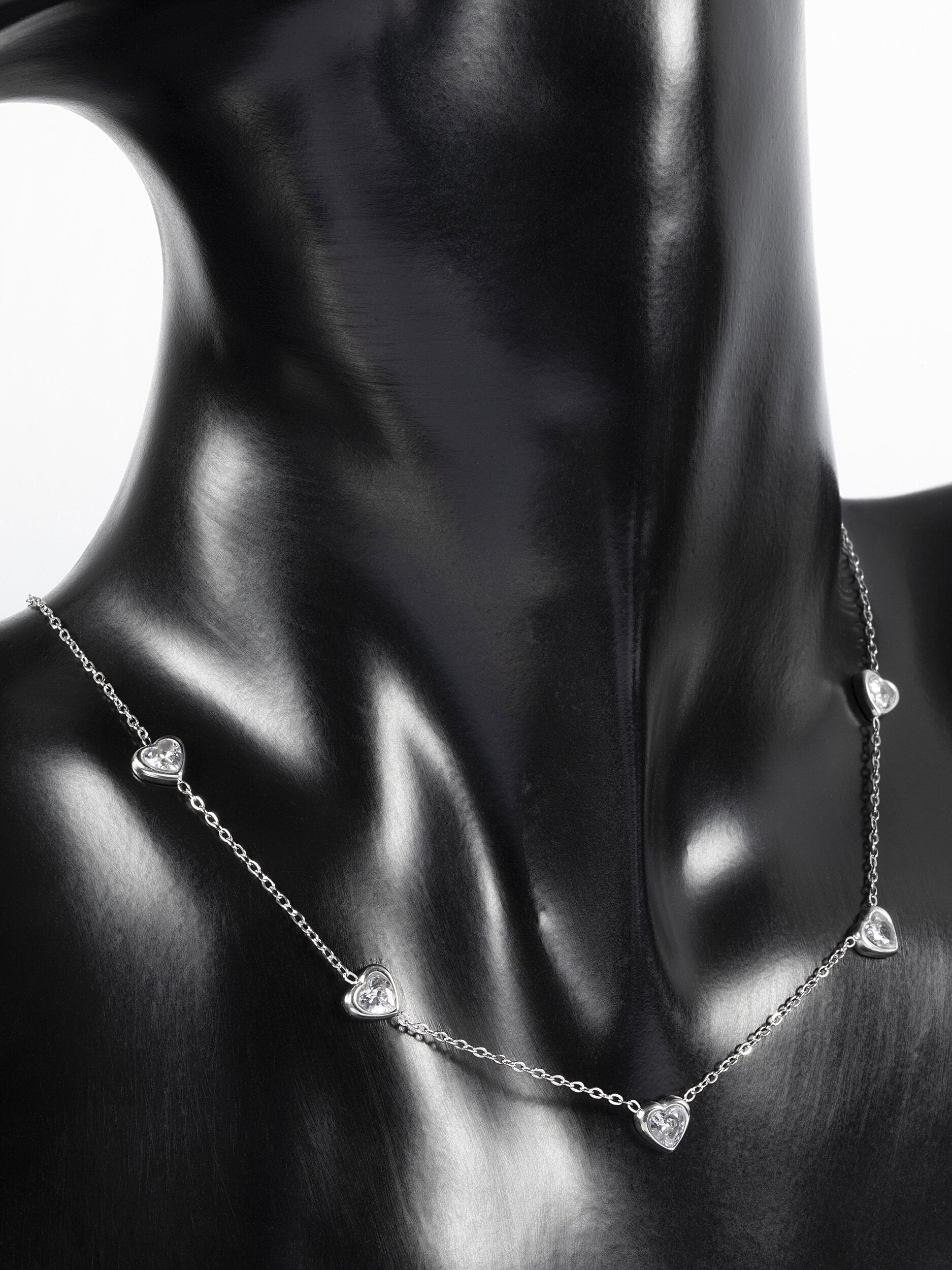 Kouzelný náhrdelník, který potěší každou ženu. Tento náhrdelník je z chirurgické oceli, která nemění barvu a je hypoalergenní. Na náhrdelníku jsou drobná srdíčka, která jsou osazena čirými třpytivými krystalky. Náhrdelník má zapínání na karabinku, dle zapnutí karabinky se liší délka. Jednoduše můžete mít 40 - 45 cm dlouhý řetízek. Udělejte si i vy radost tímto elegantním a stylovým kouskem!