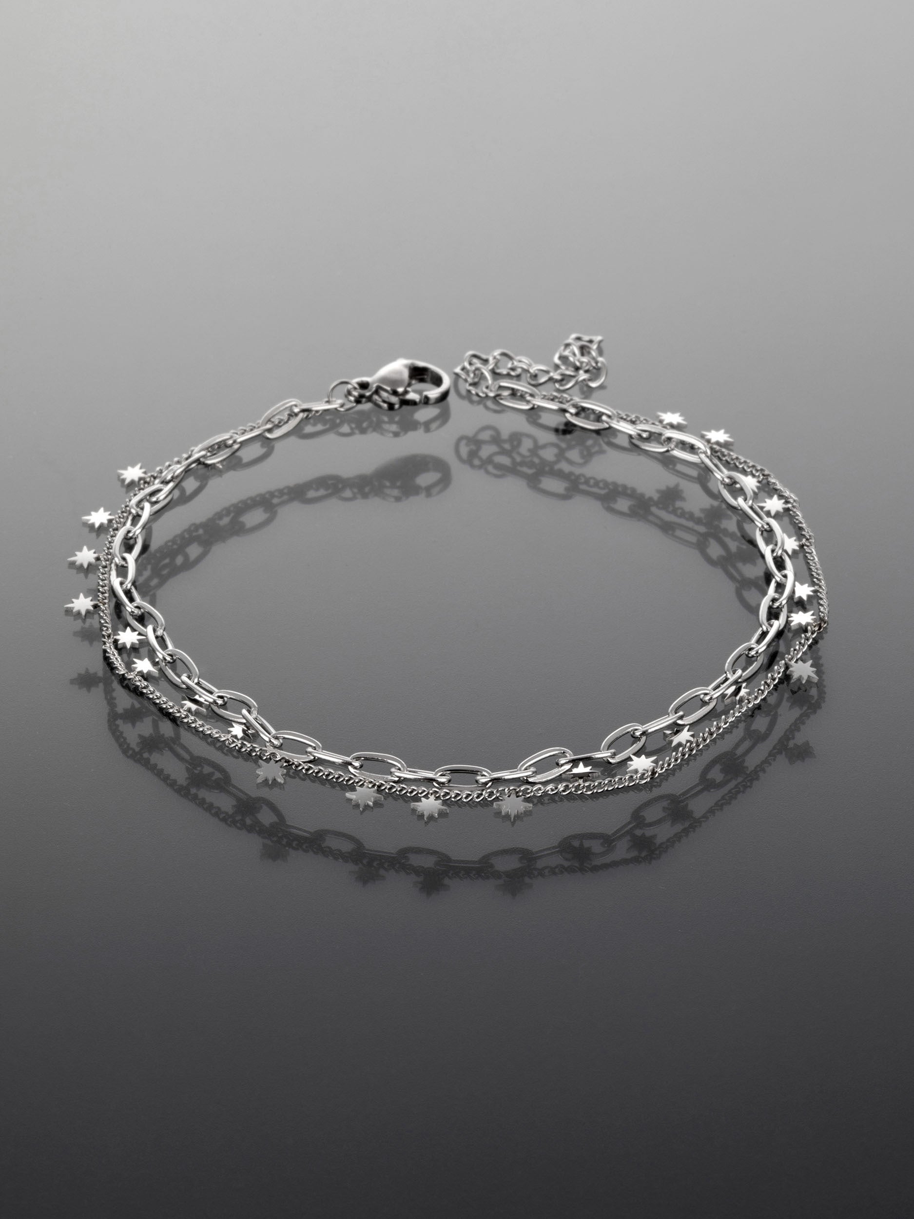 Exkluzivní dvojitý náramek z chirurgické oceli s drobnými hvězdičkami je skvělým doplňkem k jakémukoliv outfitu. Délka náramku je nastavitelná od 17 do 20 cm, průměr hvězdiček je 0,3 cm. Zapínání je na karabinku, tento typ zapínání skvěle drží a tak náramek samovolně nespadne. Náramek je tvořen dvěma řetízky stříbrné barvy, na jednom z nich jsou po celé délce přívěsky drobných hvězdiček, zpracování působí opravdu vkusně a nadčasově.