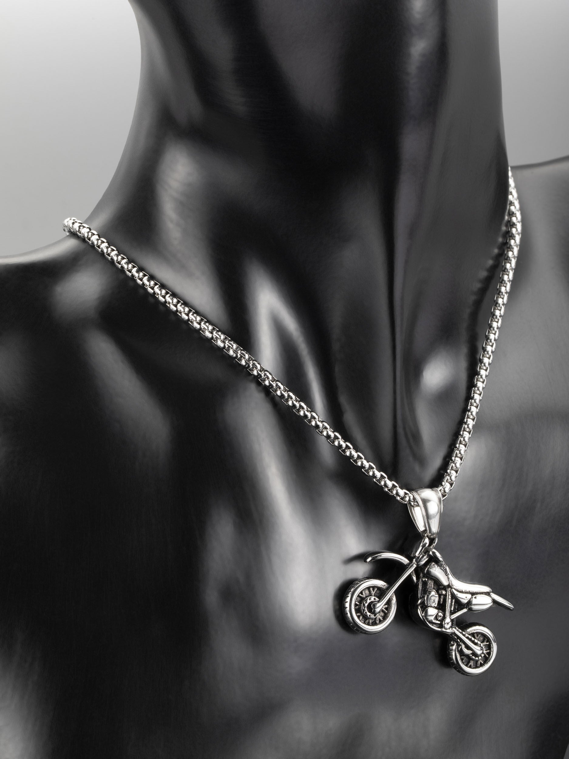 Exkluzivní masivní přívěsek ve tvaru plastické motorky z chirurgické oceli je skvělým doplňkem k jakémukoliv outfitu.
