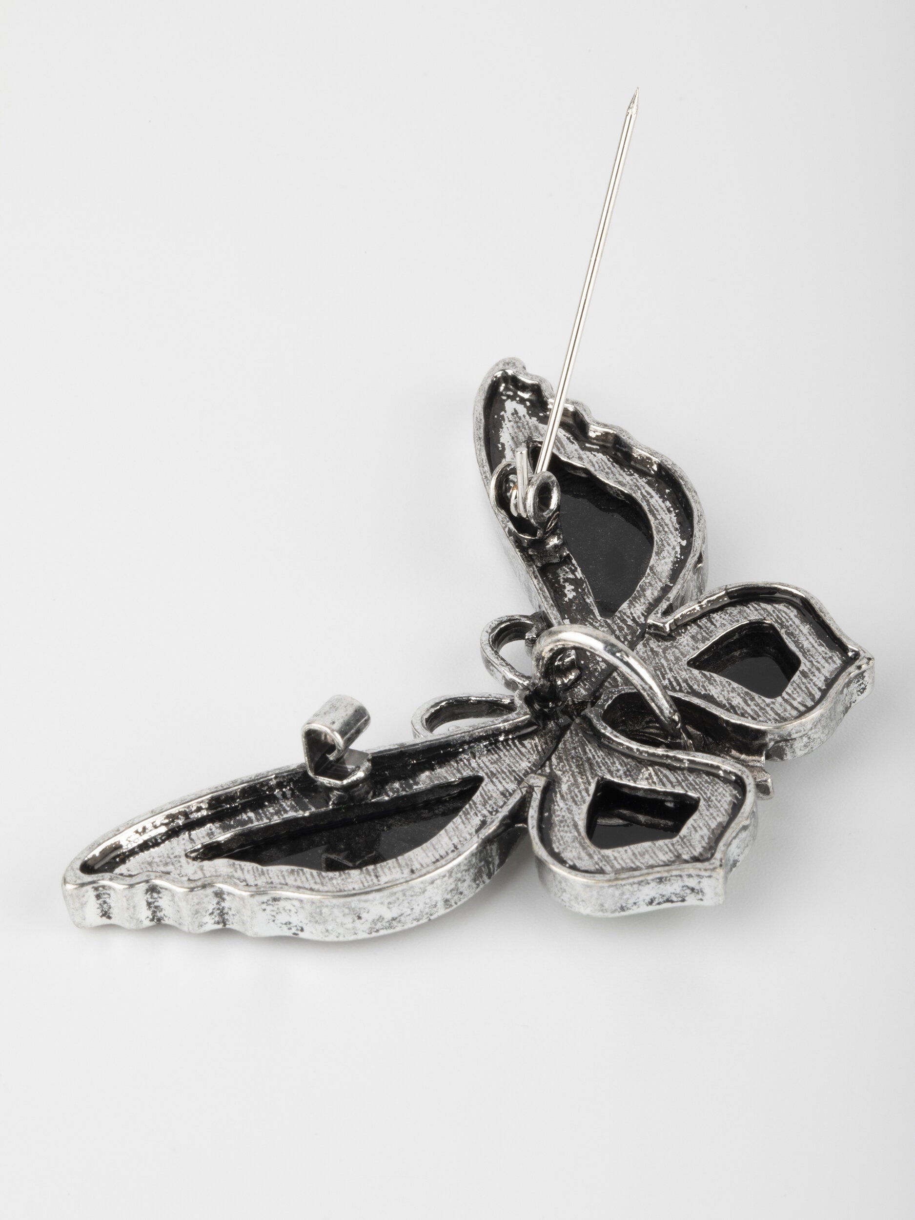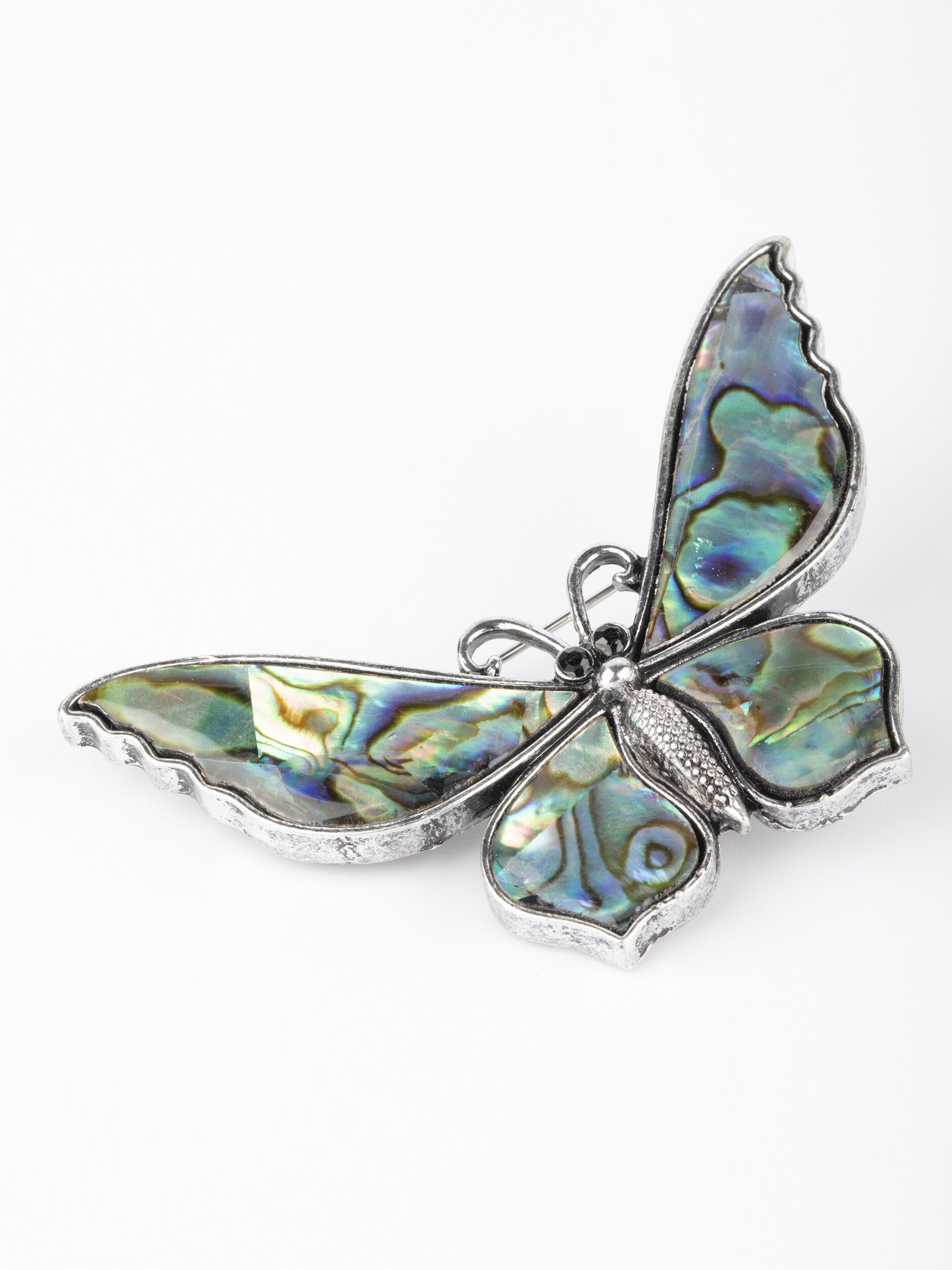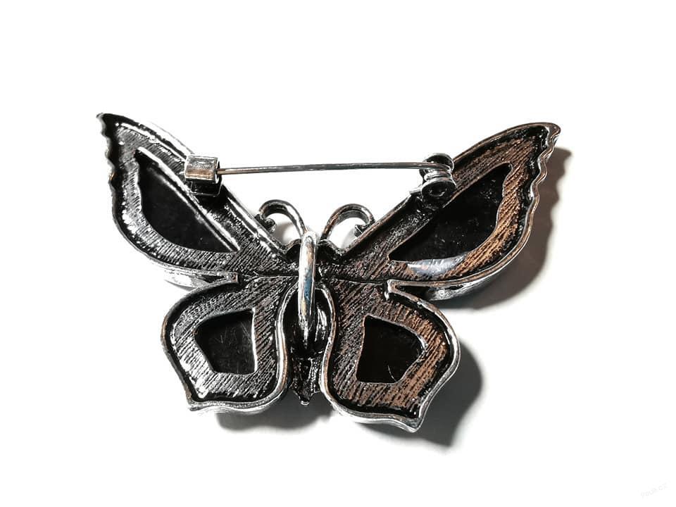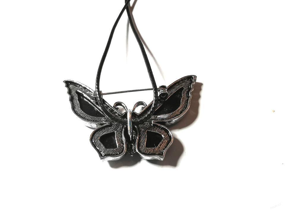 Přívěsek stříbrné barvy ve tvaru motýla má rozměry 6,1 x 4 cm. Přívěsek je vyobrazením motýla , který je zdoben rytými detaily, křídla má vykládána modrou perletí, oči jsou zdobeny černými krystaly. Zezadu je připínací špendlík a očko, kterým se dá probléknout řetízek, dá se tedy použít nejen jako přívěsek, ale také i jako brož. Jednoduché provedení působí velmi moderně, elegantně a nadčasově. Větší rozměry jsou vhodné pro ženu s oblibou výrazných šperků.
