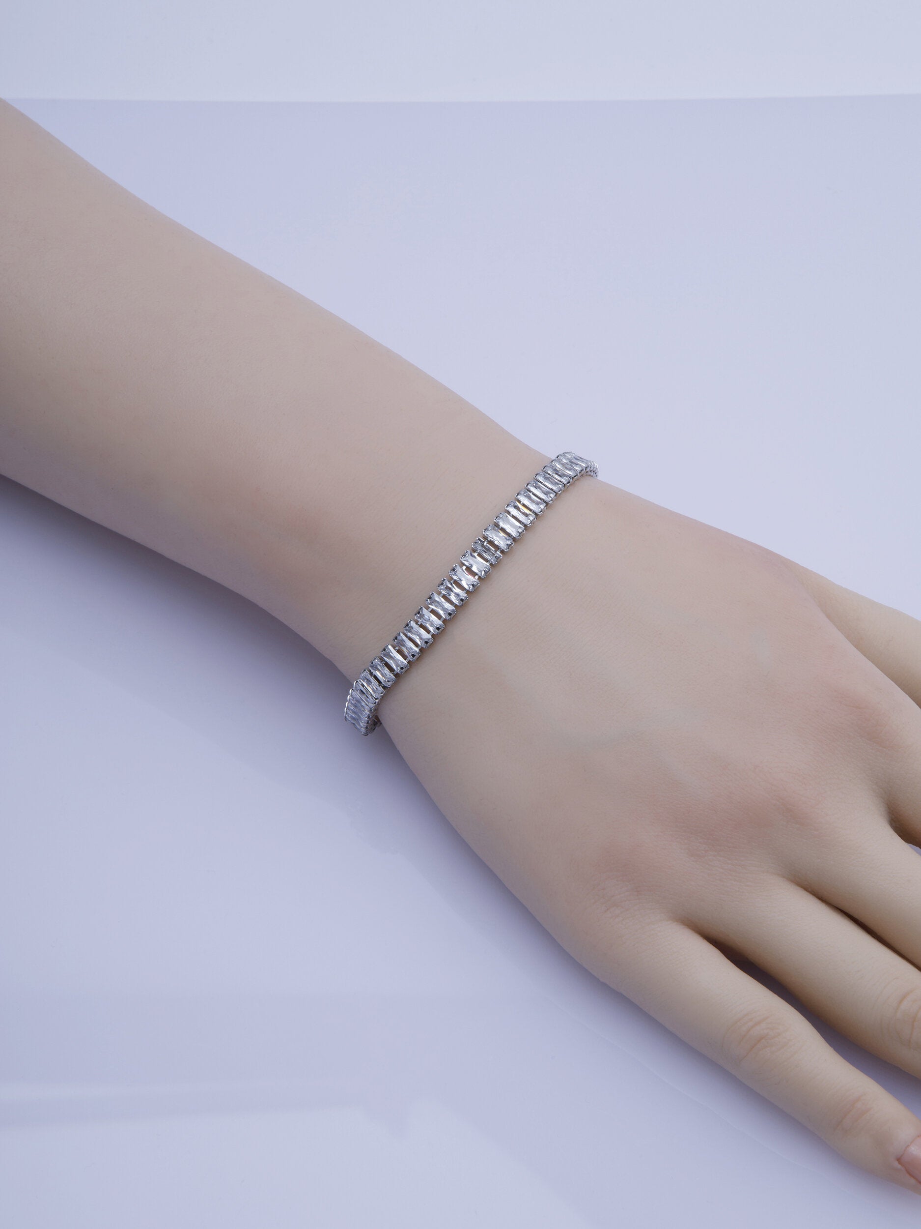 Náramek je tvořen obdélníkovými štrasovými třpytivými čirými krystalky po celém obvodu, zpracování působí opravdu vkusně a nadčasově.