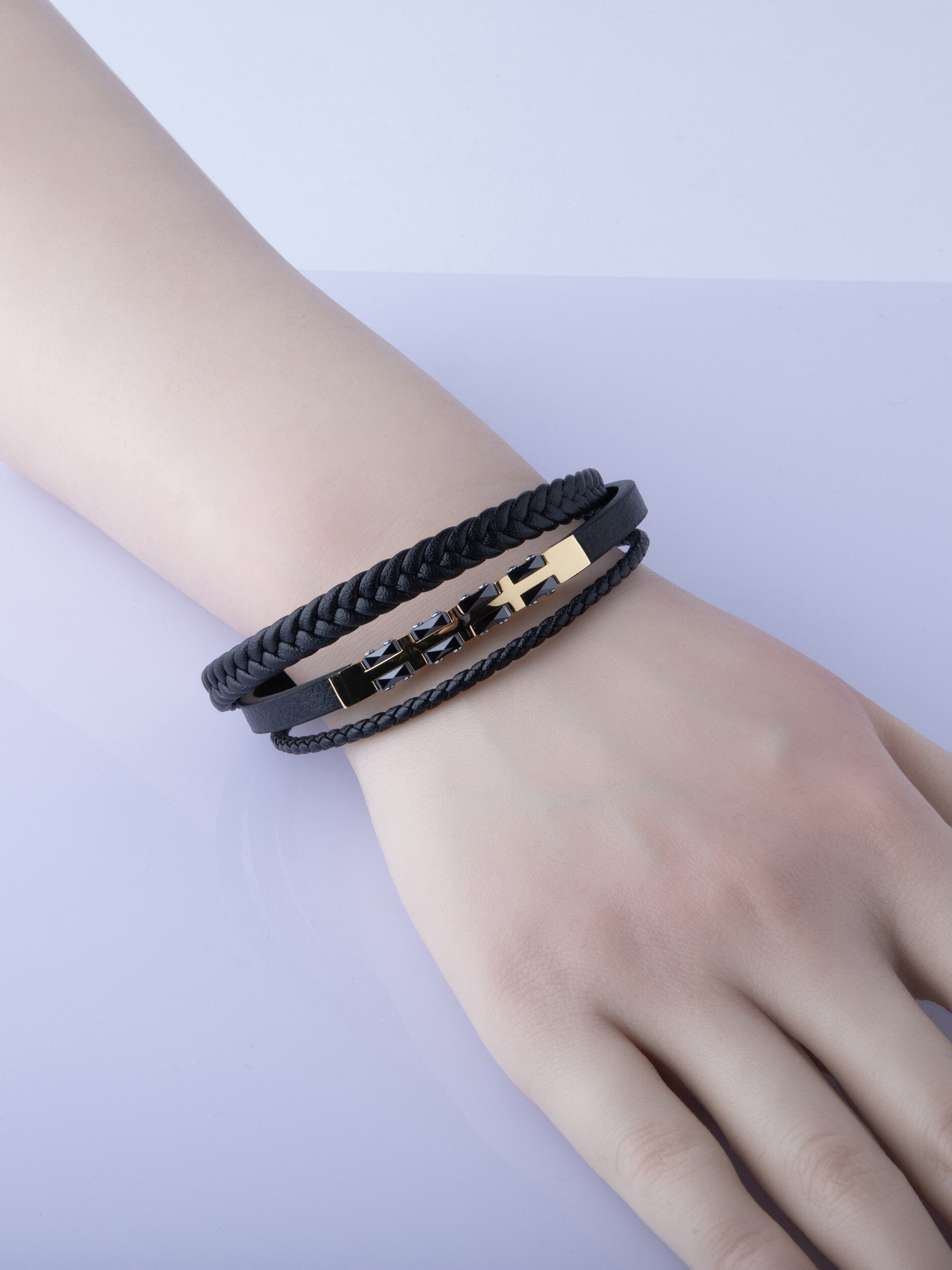 Exkluzivní pánský náramek vyrobený z pravé kůže s detailem a zapínáním z chirurgické oceli zlaté barvy. Je vyroben z hladkých a splétaných řemínků v černé barvě. Zapínání je na sponu s magnetem.