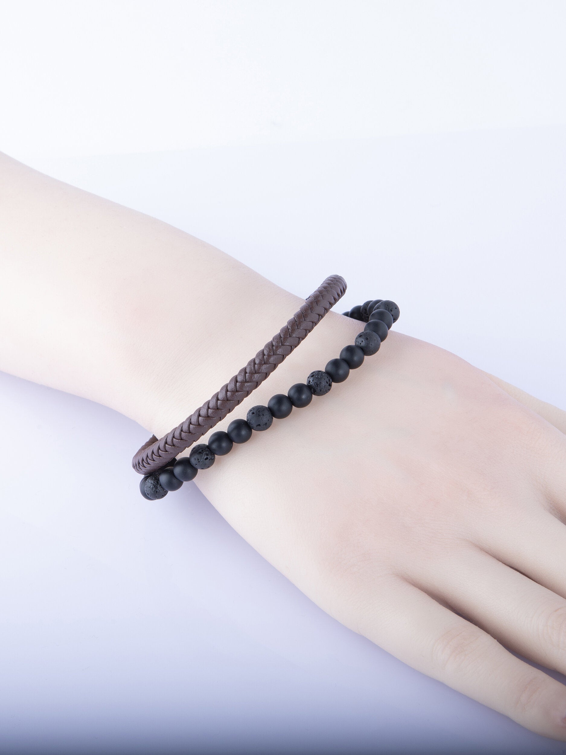 Pánský dvoupramenný náramek vyrobený z pravé kůže splétané do copánků a korálků z lávového kamene. Zapínání je na sponu s magnetem.