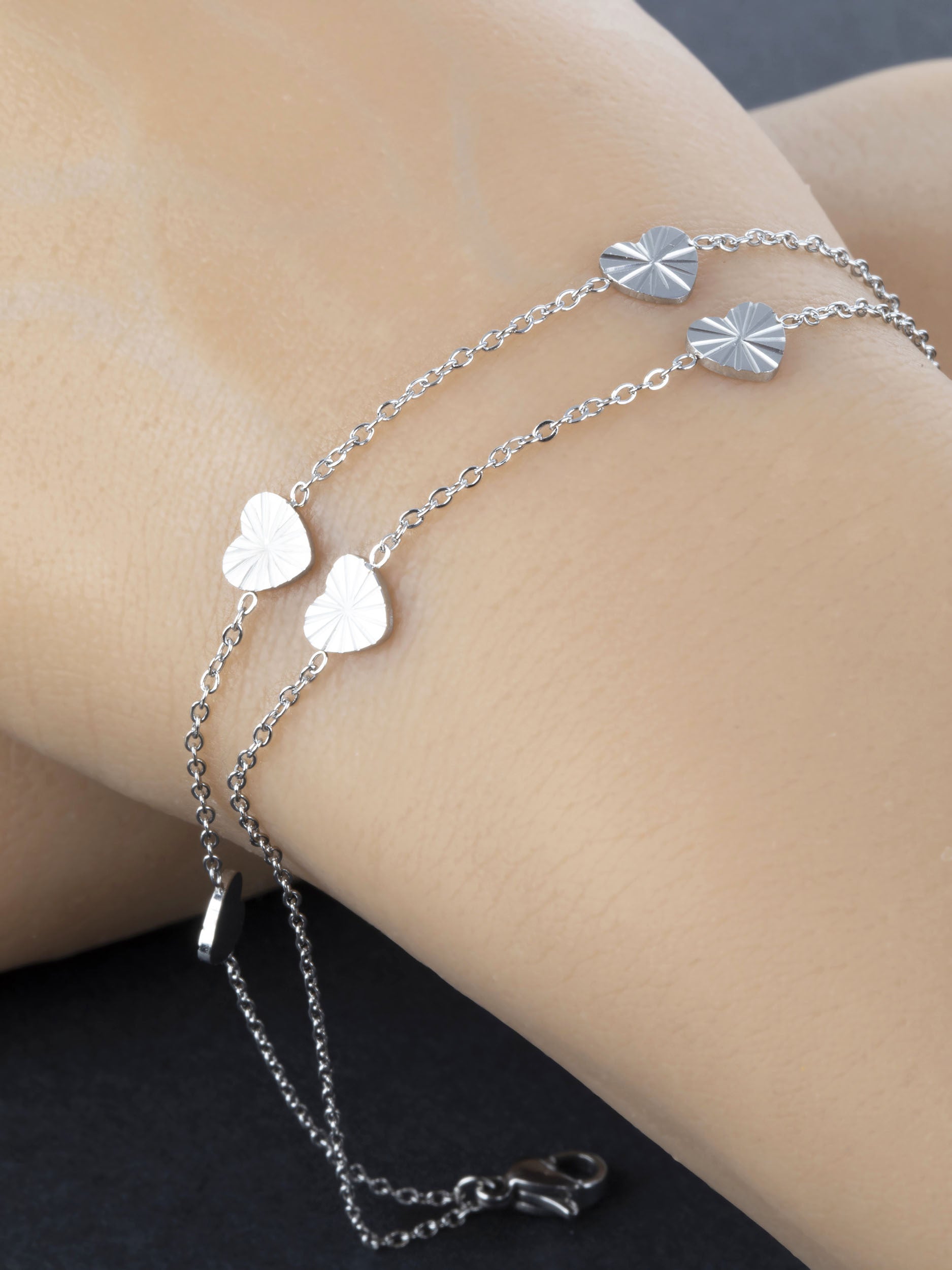 Krásný dvojitý náramek z chirurgické oceli s drobnými srdíčky je skvělým doplňkem k jakémukoliv outfitu. Délka náramku je nastavitelná od 18 do 21 cm, průměr srdíček je 0,6 cm. Zapínání je na karabinku, tento typ zapínání skvěle drží a tak náramek samovolně nespadne. Náramek je tvořen jemným dvojitým řetízkem stříbrné barvy, na kterém jsou srdíčka s rytým detailem, zpracování působí opravdu vkusně a nadčasově.