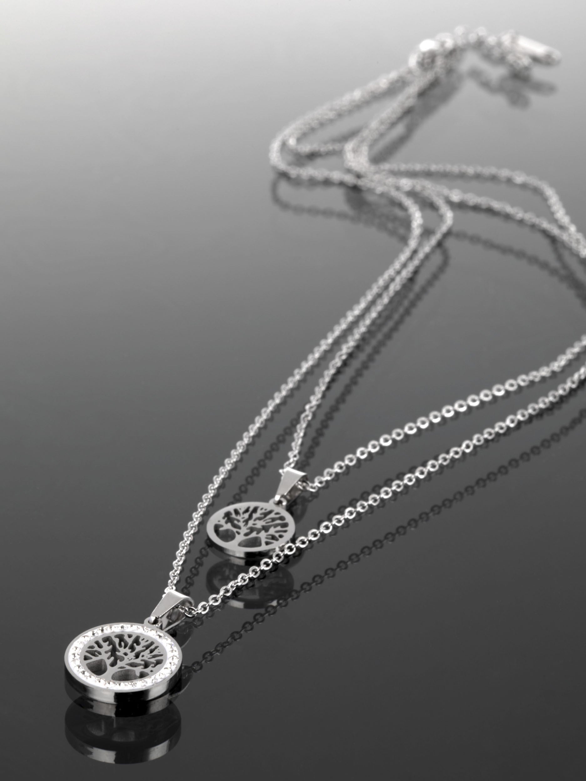 Krásný dvojitý náhrdelník se stromy života z chirurgické oceli. Větší strom života je po obvodu vykládaný třpytivými čirými krystaly.