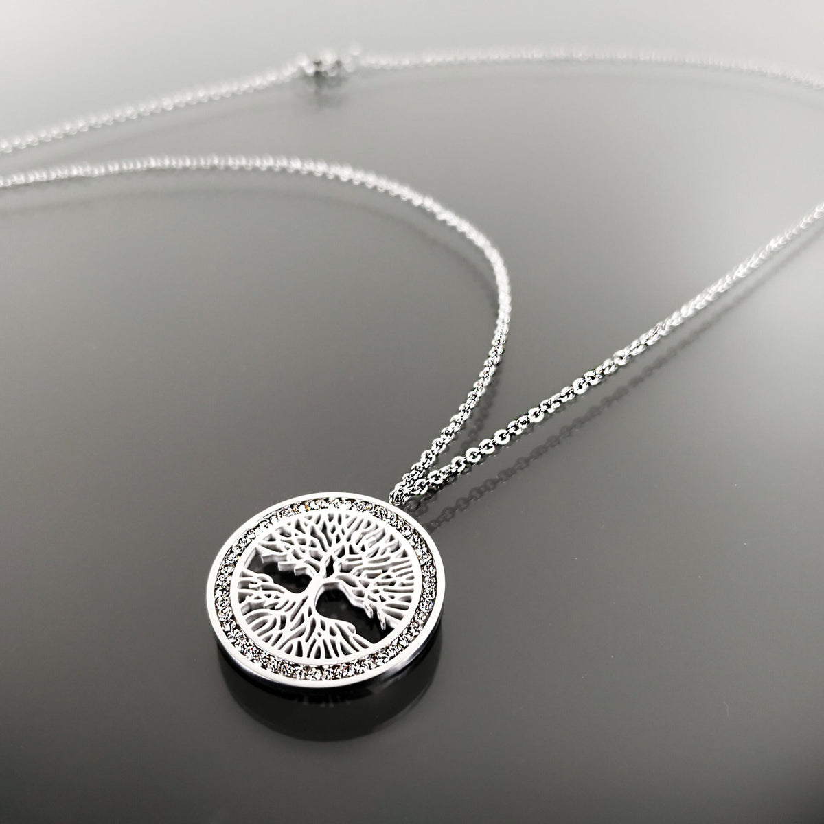 Krásný náhrdelník z chirurgcké oceli ve tvaru kruhu s motivem stromu života vykládaný čirými krystaly, je moderním a elegantním doplňkem, hodícím se ke každému outfitu. Průměr kruhu je 2 cm, délka řetízku je 50 cm.