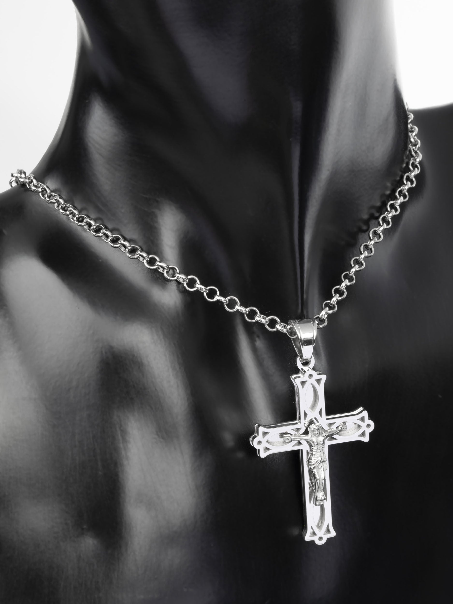 Krásný přívěsek ve tvaru kříže s Ježíšem z chirurgické oceli je skvělým doplňkem k jakémukoliv outfitu.