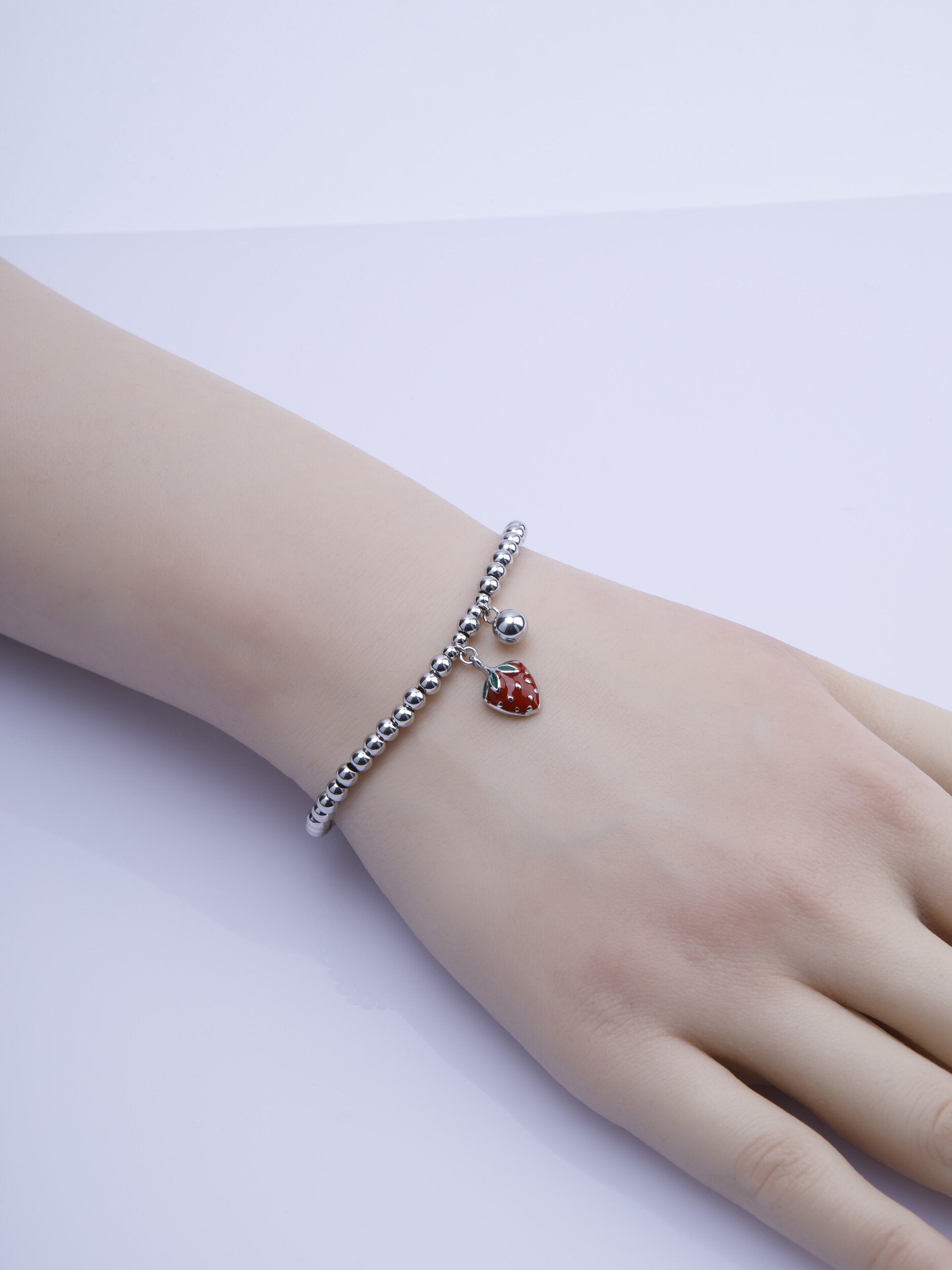 Krásný kuličkový náramek z chirurgické oceli je skvělým doplňkem k jakémukoliv outfitu. Délka náramku je cca 17 cm. Bez zapínání, stačí jen natáhnout na zápěstí. Náramek je tvořen kuličkami a ozdoben červenou jahůdkou. Zpracování působí opravdu vkusně a nadčasově.
