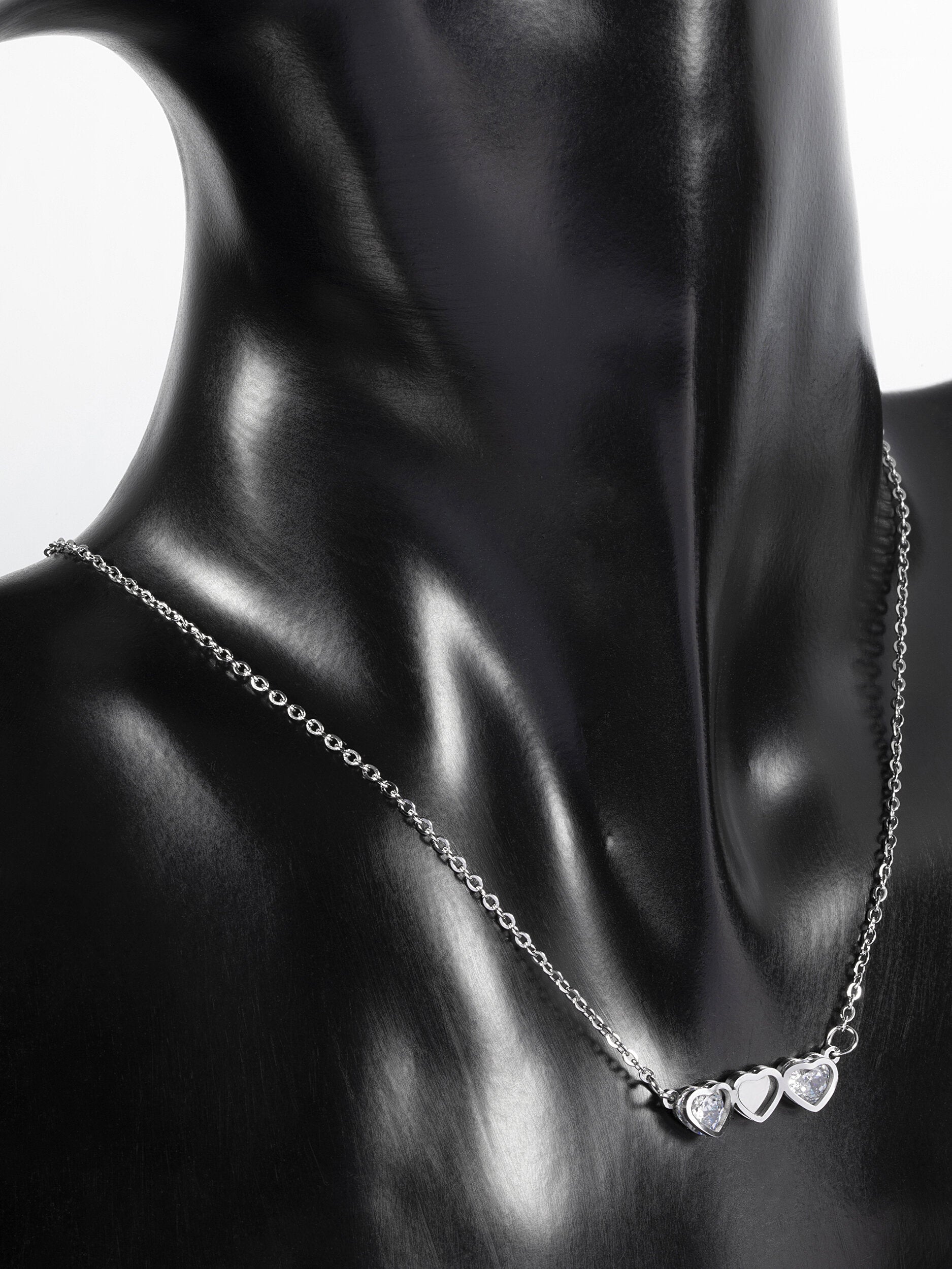 Romantický náhrdelník z leštěné chirurgické oceli s přívěškem ve tvaru tří srdcí, zdobený třpytivými kamínky. Je skvělým doplňkem k jakémukoli outfitu. Délka náhrdelníku je nastavitelná cca od 40 do 45 cm, každé srdíčko měří 0,5 x 0,5 cm. Zapínání je na karabinku, tento typ zapínání skvěle drží a tak náhrdelník samovolně nespadne. Náhrdelník je tvořen jemným řetízkem stříbrné barvy, na kterém je připojen přívěšek, zpracování působí opravdu vkusně.