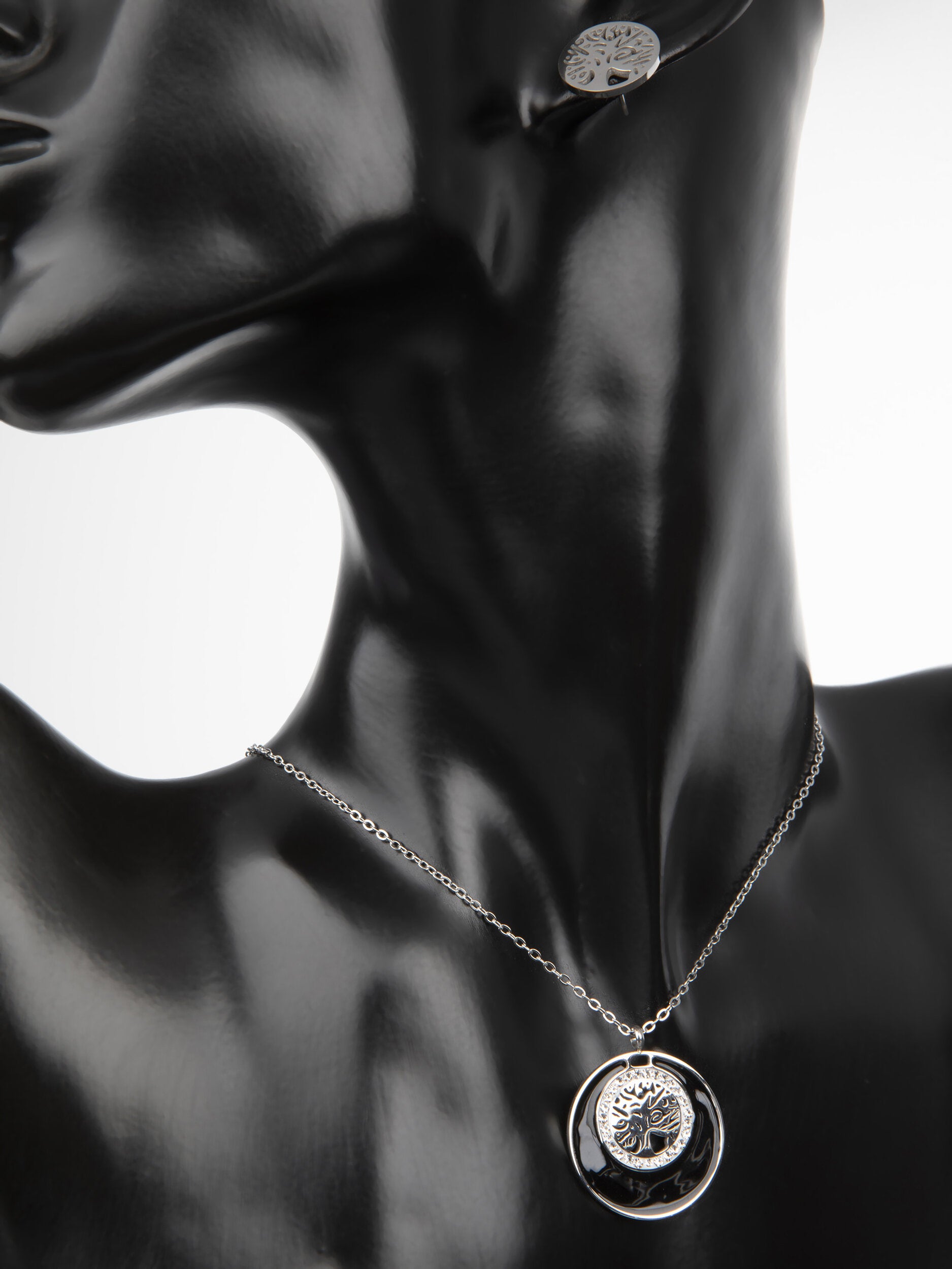Luxusní sada náušnic a přívěsku na řetízku z chirurgické oceli s kroužky s motivem stromu života je skvělým doplňkem k jakémukoliv outfitu. Průměr náušnic je 1,5 cm. Sada se skládá z náušnic ve tvaru kroužků, zapínání je na puzetku, tento typ zapínání skvěle drží a tak náušnice samovolně nevypadnou. Na 40 - 45 cm dlouhém drobném řetízku je přívěsek ve tvaru kruhu s motivem stromu života, který je po obvodu vykládán drobnými čirými krystaly, strom života je zasazen v černém poli, průměr přívěsku je 2,5 cm, zapínání je na karabinku.