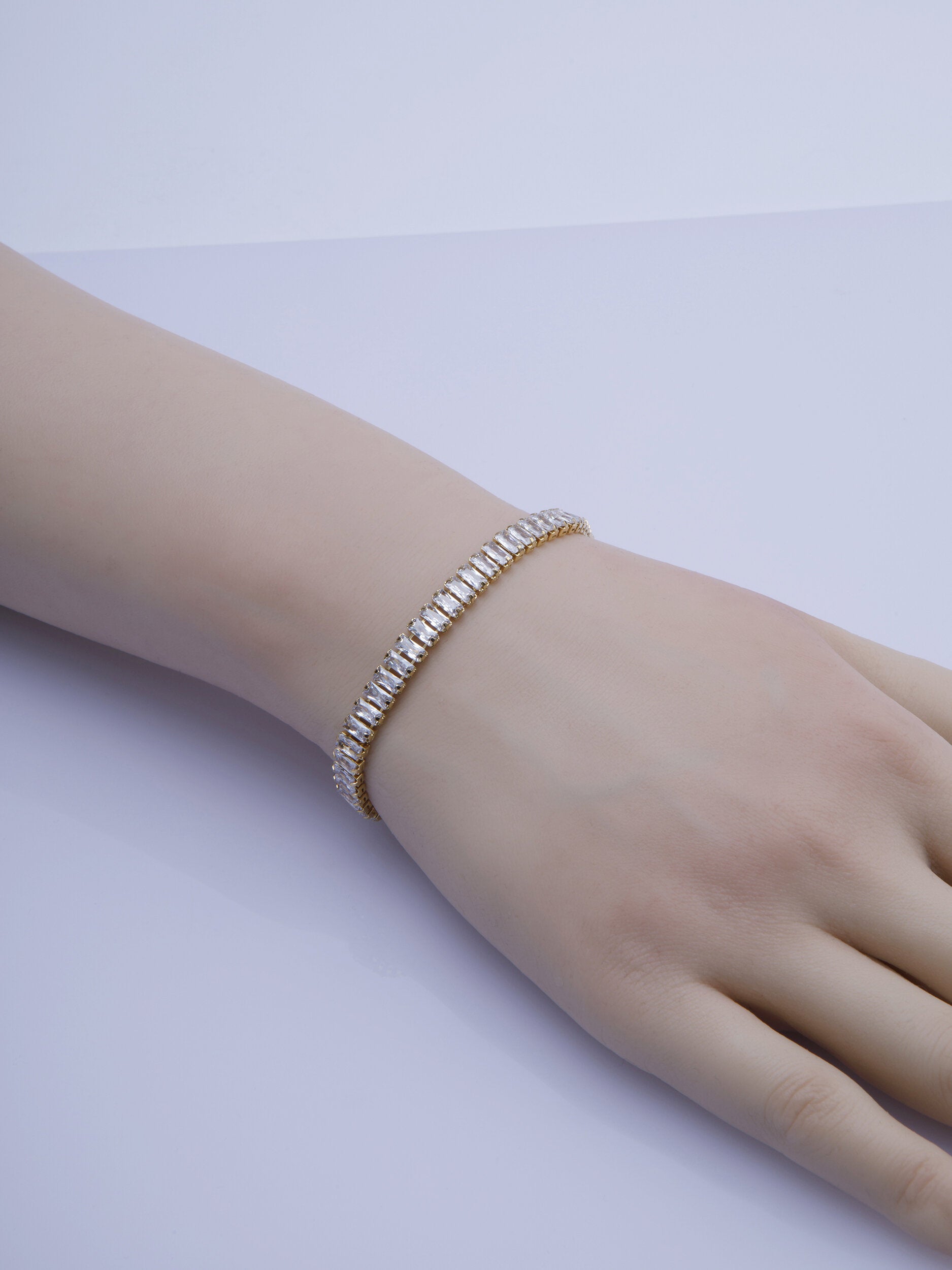Náramek je tvořen obdélníkovými štrasovými třpytivými čirými krystalky po celém obvodu, zpracování působí opravdu vkusně a nadčasově.