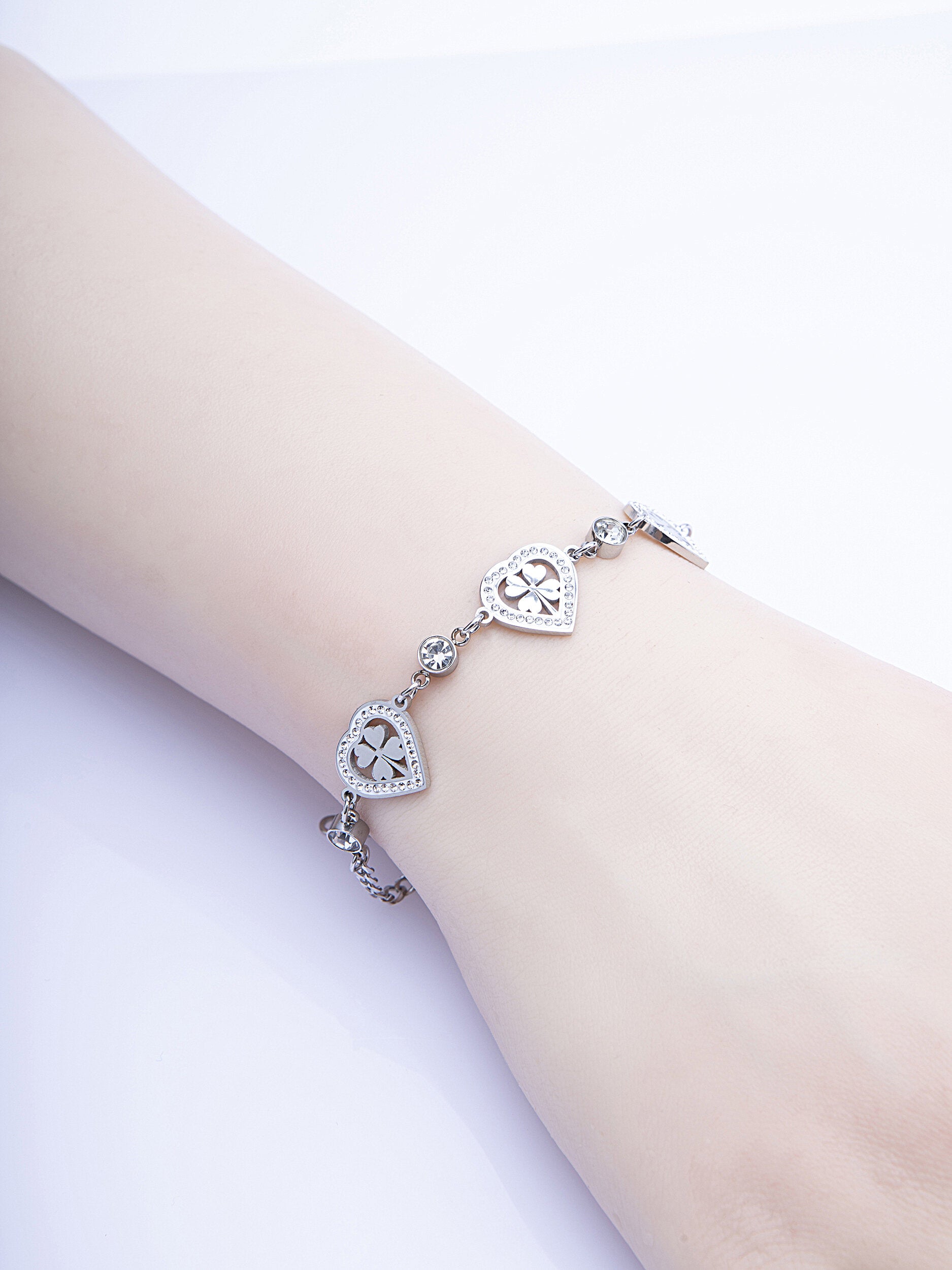 Tento kouzelný náramek se srdíčky a čtyřlístky si zamilujete! Náramek je z chirurgické oceli, která nemění barvu a je hypoalergenní. Na náramku najdete přívěsky ve tvaru srdíčka se čtyřlístkem uvnitř, srdíčko je zdobeno drobnými krystalky. Zapínání náramku je na karabinku. Udělejte si radost tímto kouzelným doplňkem i vy!