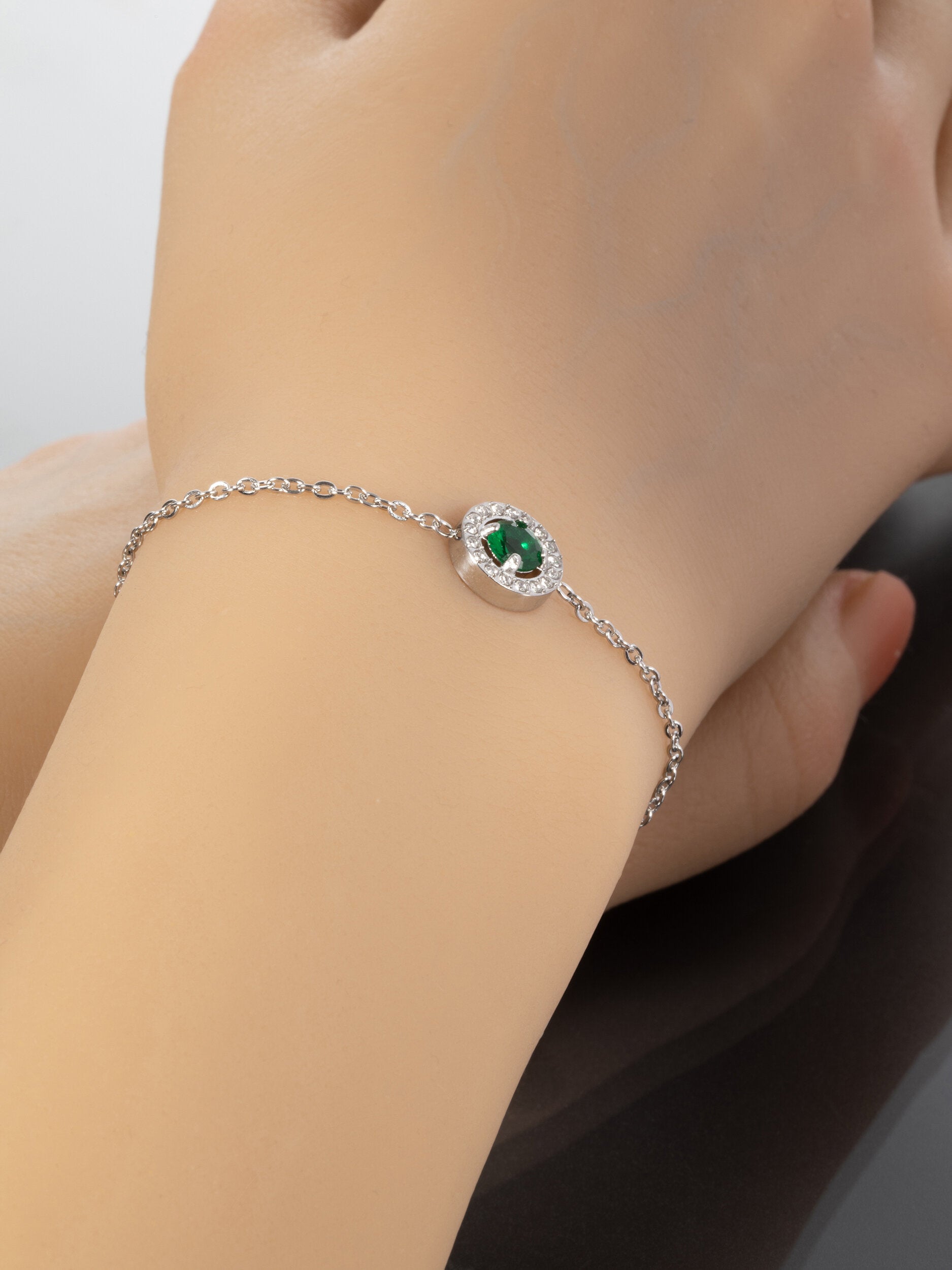Tento jedinečný náramek si zamilujete! Náramek je z chirurgické oceli, která nemění barvu a je hypoalergenní. Náramek je zdoben kolečkem se zeleným krystalkem uprostřed. Zapínání je na karabinku, díky které upravíte délku náramku. Udělejte si i vy radost s tímto jedinečným kouskem, který vám přinese štěstí.