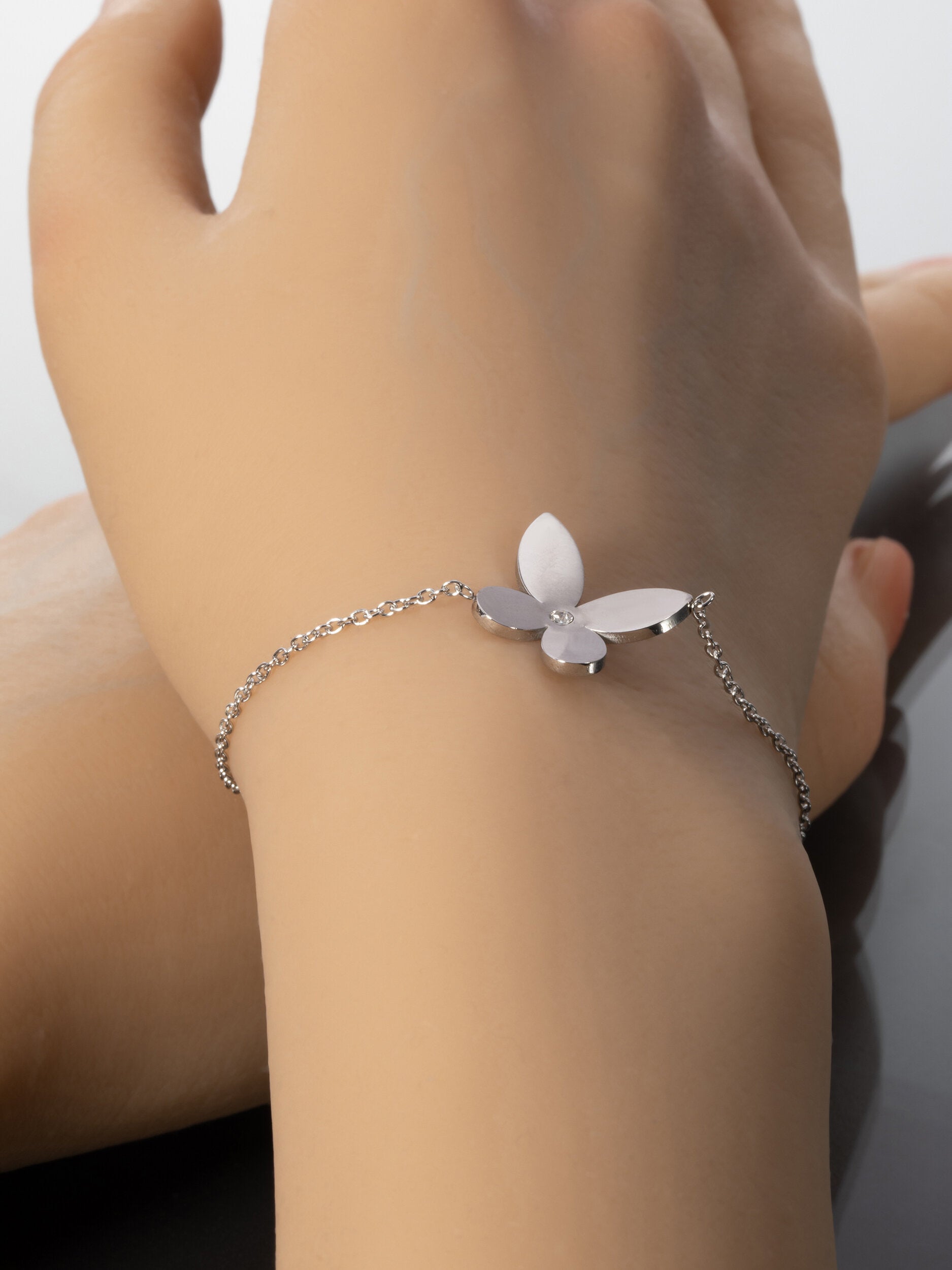 Tento jedinečný náramek si zamilujete! Náramek je z chirurgické oceli, která nemění barvu a je hypoalergenní. Náramek je zdoben motýlkem osazeným krystalkem. Zapínání je na karabinku, díky které upravíte délku náramku. Udělejte si i vy radost s tímto jedinečným kouskem, který vám přinese štěstí.
