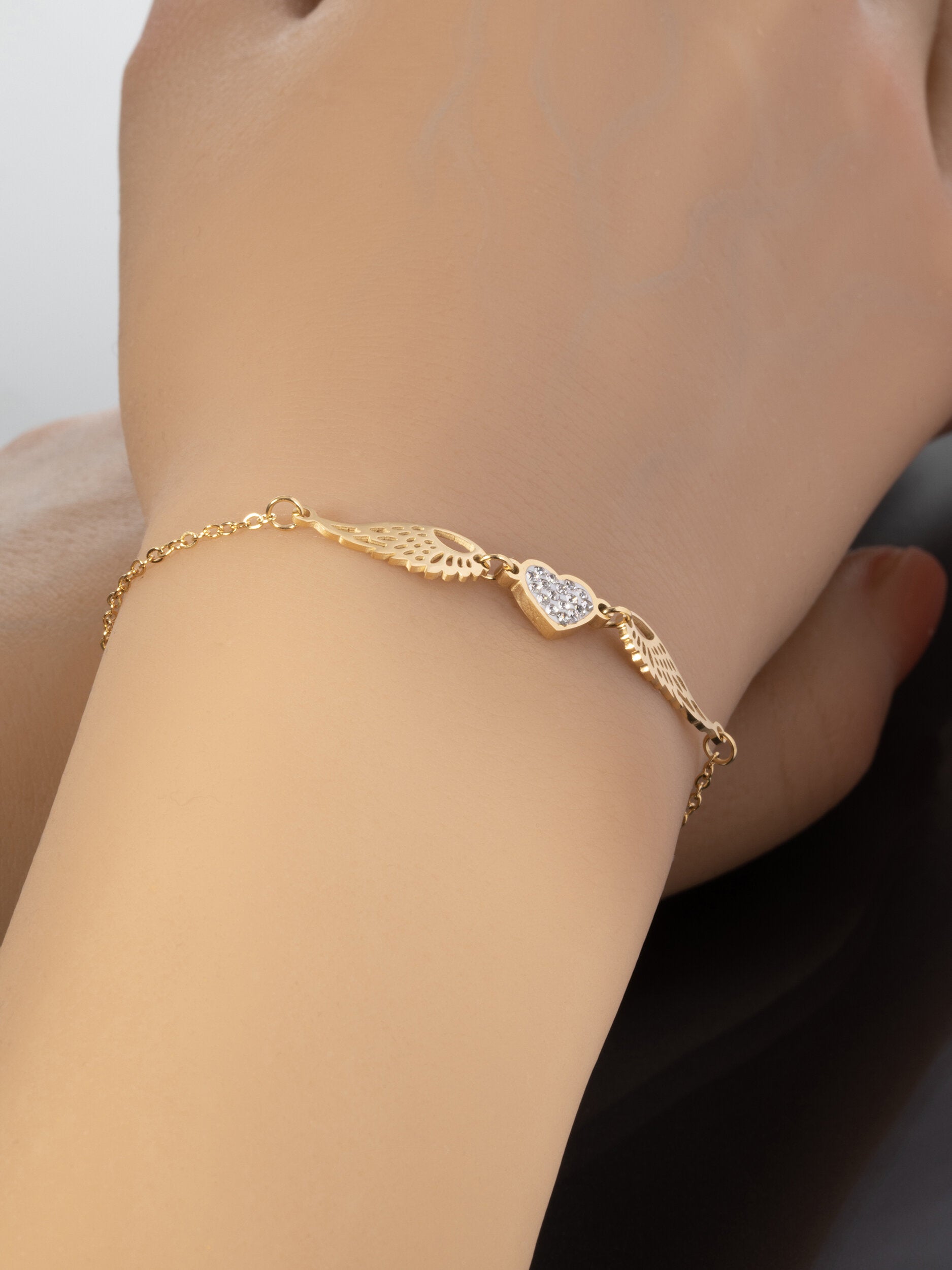 Tento jedinečný náramek si zamilujete! Náramek je z chirurgické oceli zlaté barvy, která nemění barvu a je hypoalergenní. Náramek je zdoben srdíčkem s andělskými křídly a je osazen krystalky. Zapínání je na karabinku, díky které upravíte délku náramku. Udělejte si i vy radost s tímto jedinečným kouskem, který vám přinese štěstí.