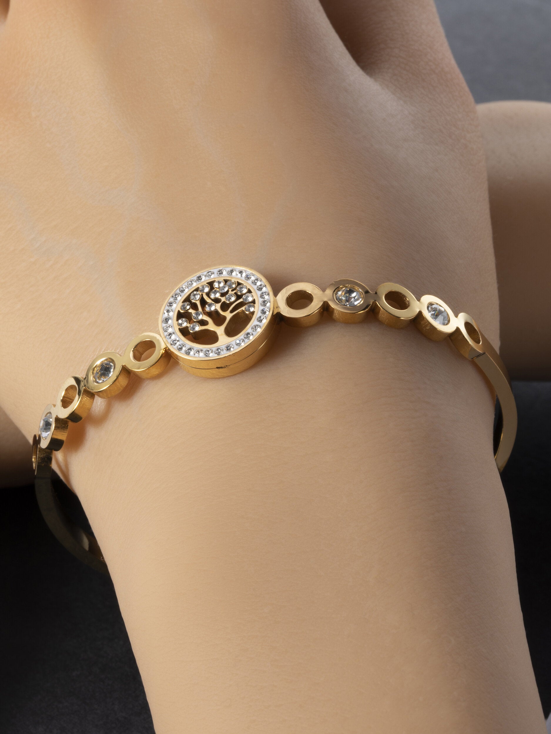 Stylový náramek, který si jednoduše zamilujete! Náramek je z chirurgické oceli, která nemění barvu a je hypoalergenní. Náramek má design stromu života a je osazen drobnými krystalky.Strom života symbolizuje centrum energie, propojení země s nebem, stabilitu, moudrost, elementy země, ohně, vody a vzduchu a také propojení všeho. Zapínání náramku je na patent. Udělejte si i vy radost s tímto jedinečným šperkem!