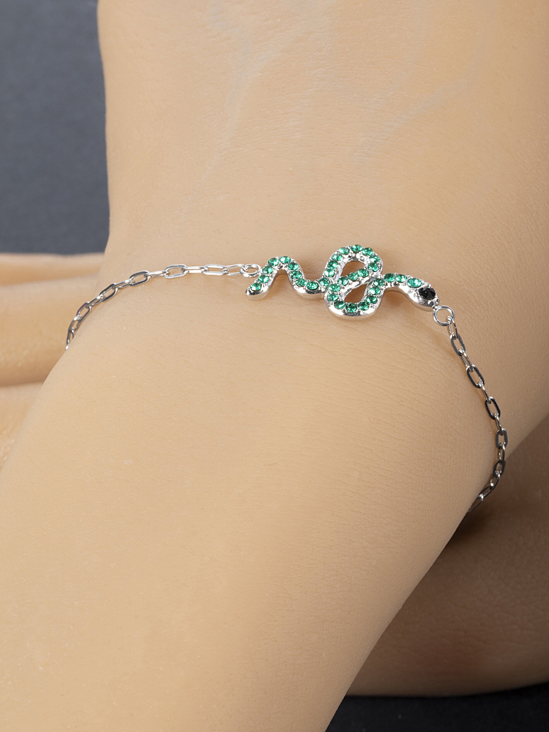 Náramek je z chirurgické oceli, která nemění barvu a je hypoalergenní. Náramek je zdoben hadem, který je osazen zelenými krystalky. Zapínání je na karabinku. Tímto kouzelným náramkem vykouzlíte úsměv na tváři každé ženy!