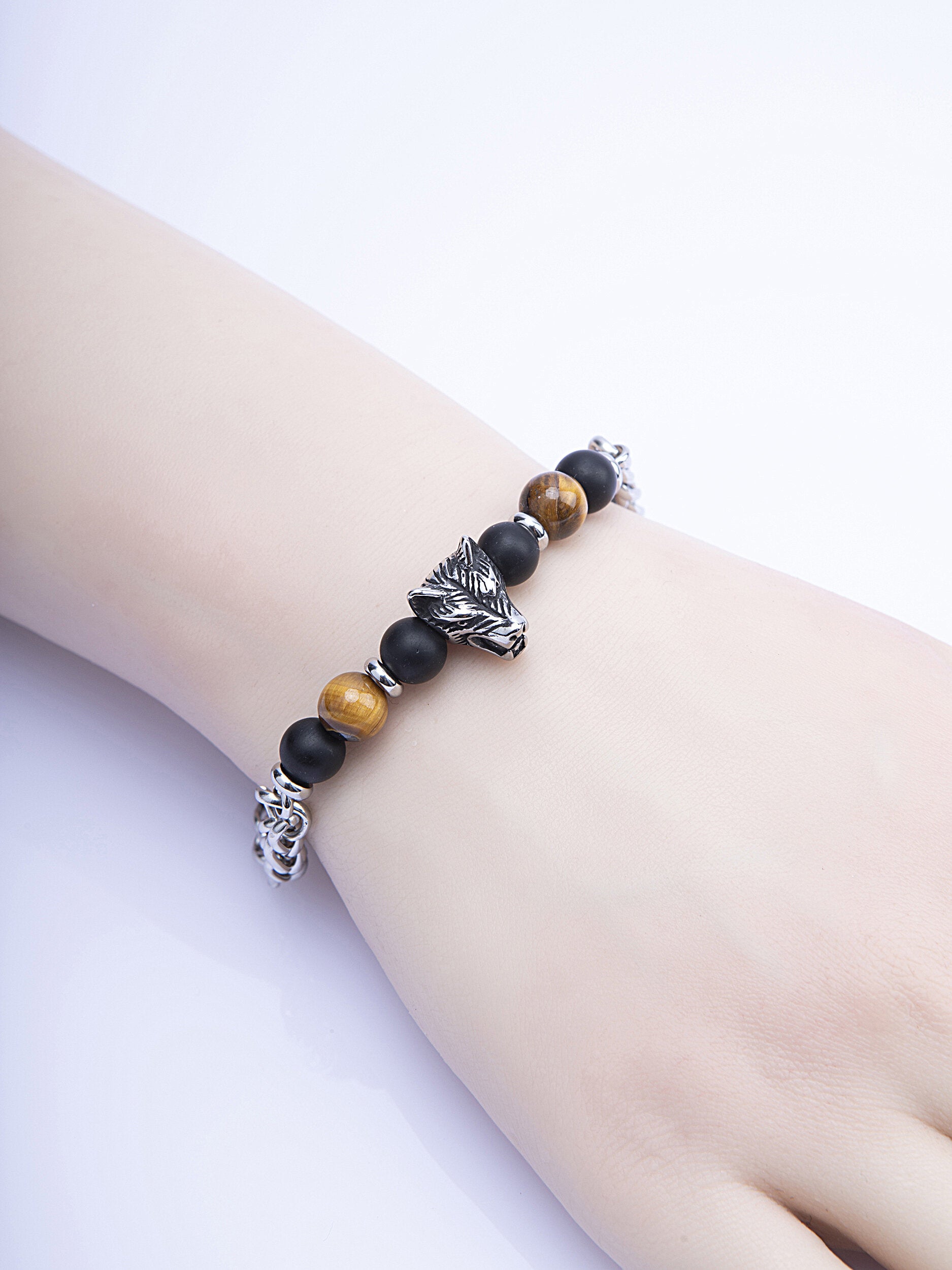 Stylový náramek s minerály a korálkem ve tvaru vlčí hlavy. Náramek je tvořen z chirurgické oceli, která nemění barvu a je hypoalergenní. Zapínání náramku je na karabinku, proto výborně drží na ruce. Délka náramku je až 21,5 cm. Délka hlavičky je cca 1,5 cm.