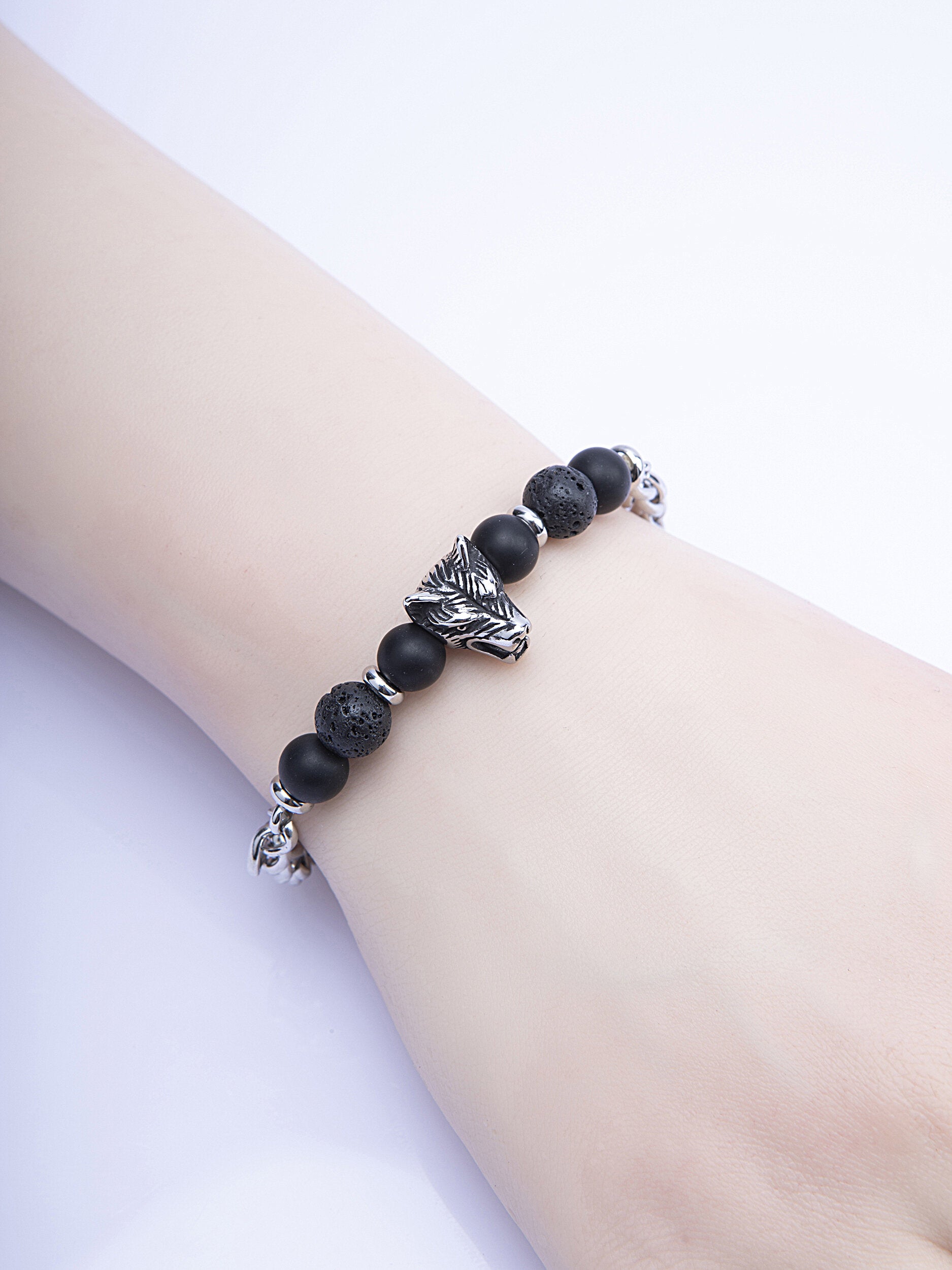 Stylový náramek s minerály a korálkem ve tvaru vlčí hlavy. Náramek je tvořen z chirurgické oceli, která nemění barvu a je hypoalergenní. Zapínání náramku je na karabinku, proto výborně drží na ruce. Délka náramku je až 21,5 cm. Délka hlavičky je cca 1,5 cm.