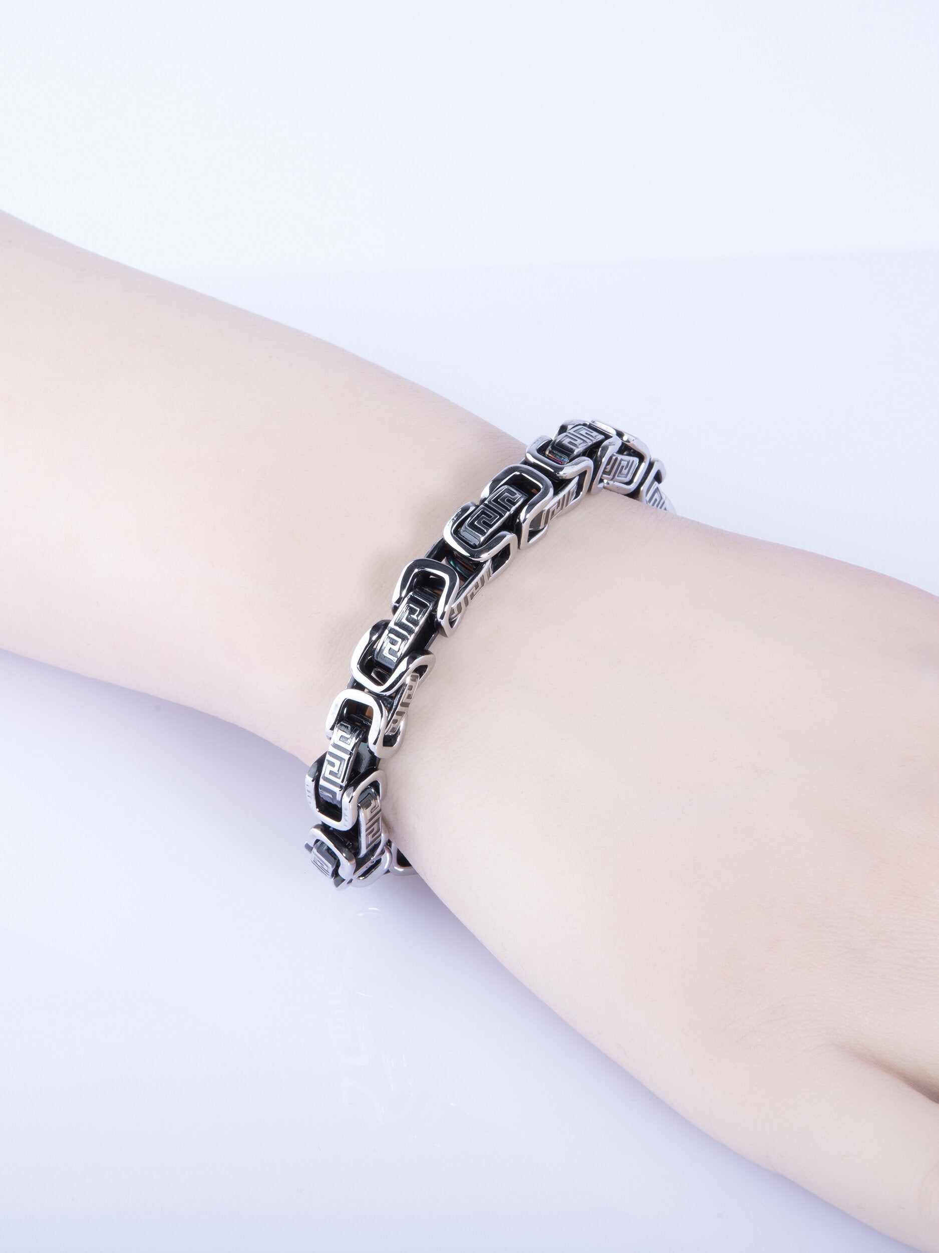 Pánský náramek, vyrobený z chirurgické oceli stříbrné barvy. Je vypracován jako zajímavý, promyšlený řetěz. Zapínání je na karabinku. Náramek je odolný a kvalitně zpracovaný. Nemění barvu a je vhodný pro alergiky.