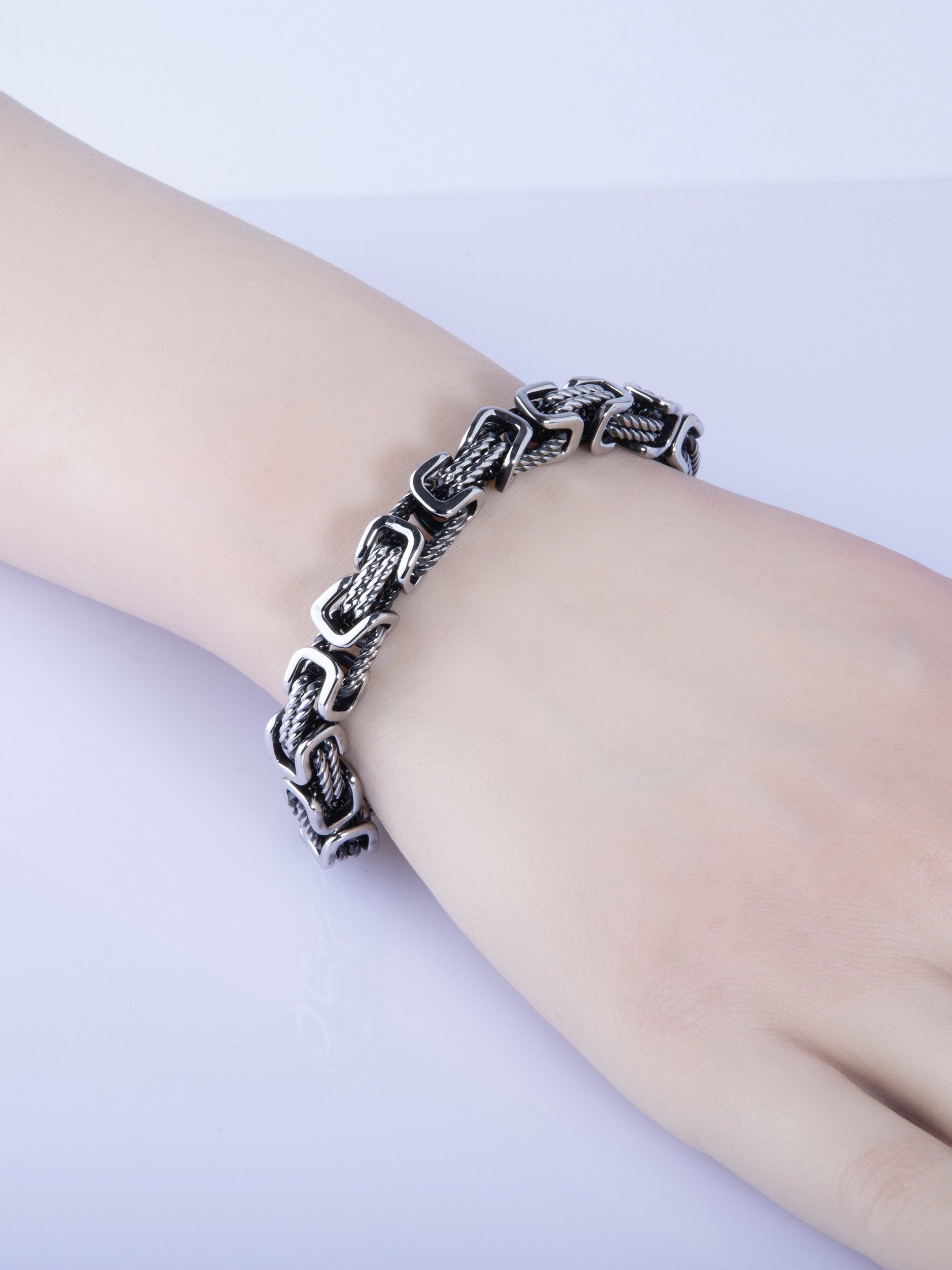 Pánský náramek, vyrobený z chirurgické oceli stříbrné barvy. Je vypracován jako zajímavý, promyšlený řetěz ze dvou tvarů oček. Zapínání je na karabinku. Náramek je odolný a kvalitně zpracovaný. Nemění barvu a je vhodný pro alergiky.