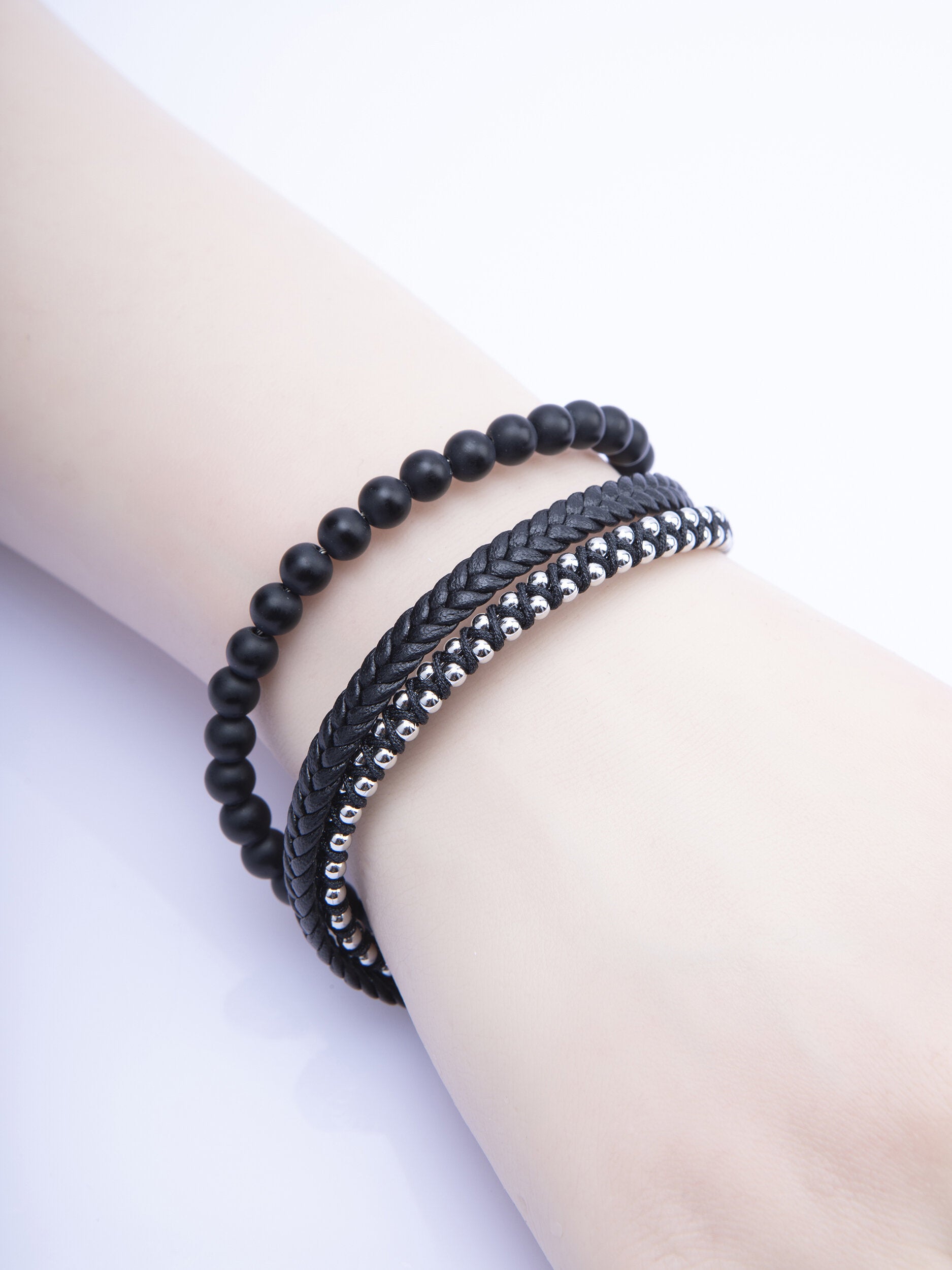 Krásný pánský náramek z pásků černé kůže a korálků z chirurgické oceli je skvělým doplňkem k jakémukoliv outfitu. Délka náramku je cca 21,5 cm, šířka náramku je cca 1,8 cm. Zapínání je magnetické, tento typ zapínání skvěle drží a tak náramek samovolně nespadne. Náramek je tvořen třemi oddělenými prameny, které jsou spojeny v místě zapínání.