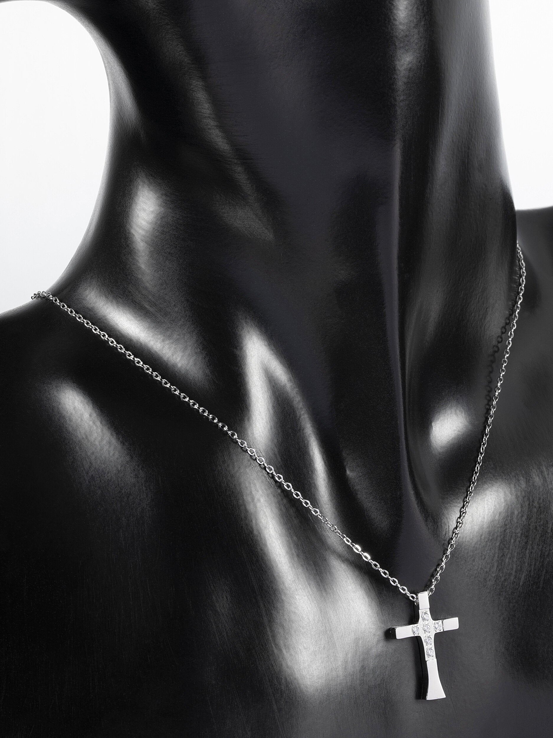 Úchvatný náhrdelník z chirurgické oceli s křížkem zdobeným drobnými čirými krystaly je skvělým doplňkem k jakémukoliv outfitu. Délka náhrdelníku je nastavitelná cca od 43 do 48 cm, rozměry většího křížku jsou 2,1 x 1,2 cm. Zapínání je na karabinku, tento typ zapínání skvěle drží a tak náhrdelník samovolně nespadne. Náhrdelník je tvořen jemným řetízkem stříbrné barvy, na kterém je umístěn přívěšek ve tvaru křížku, který je je zdoben drobnými čirými krystaly. Zpracování působí opravdu vkusně a nadčasově.