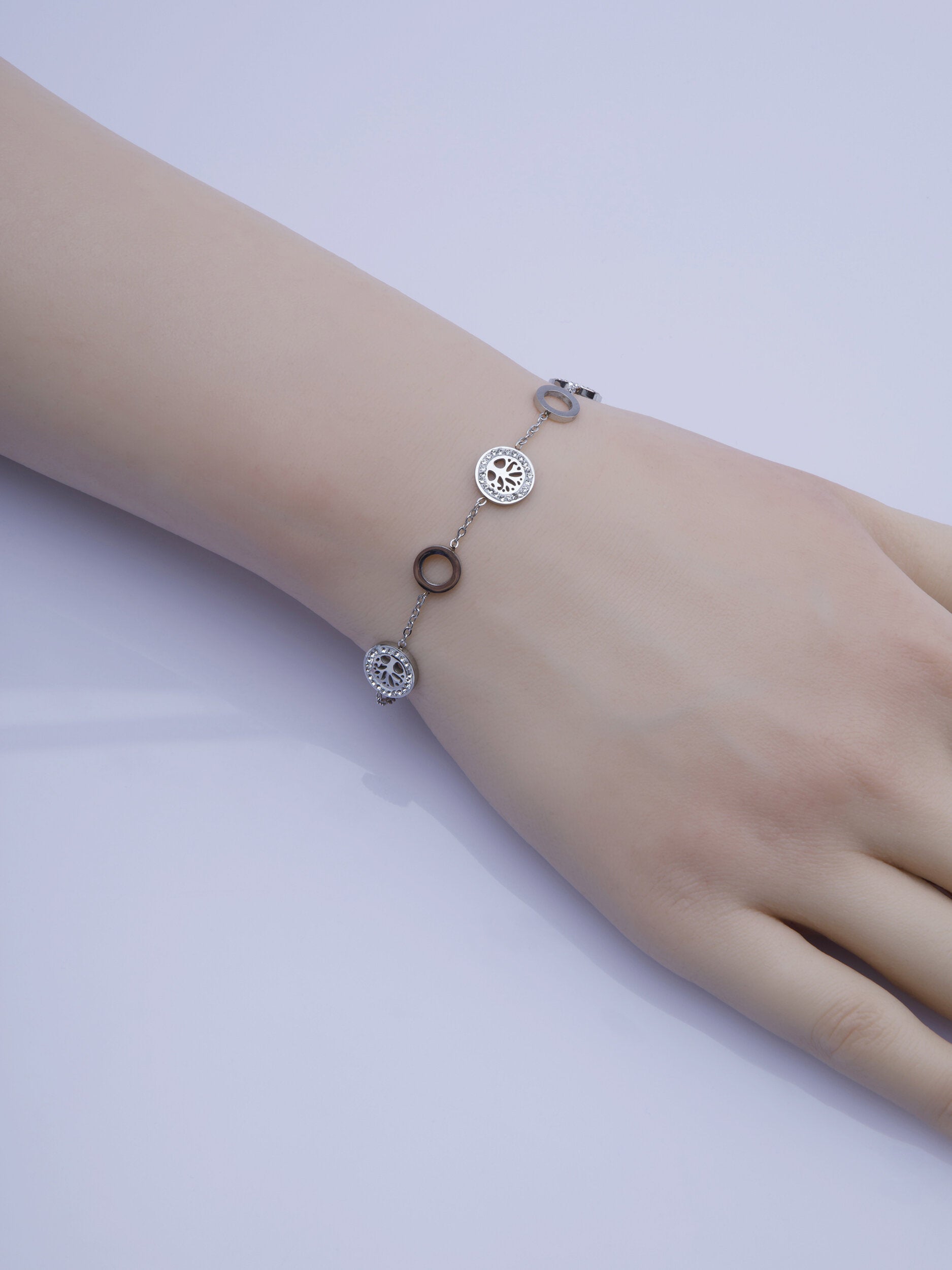 Náramek je tvořen řetízkem, na němž jsou umístěna kolečka s motivem stromu života, zpracování působí opravdu vkusně a nadčasově.