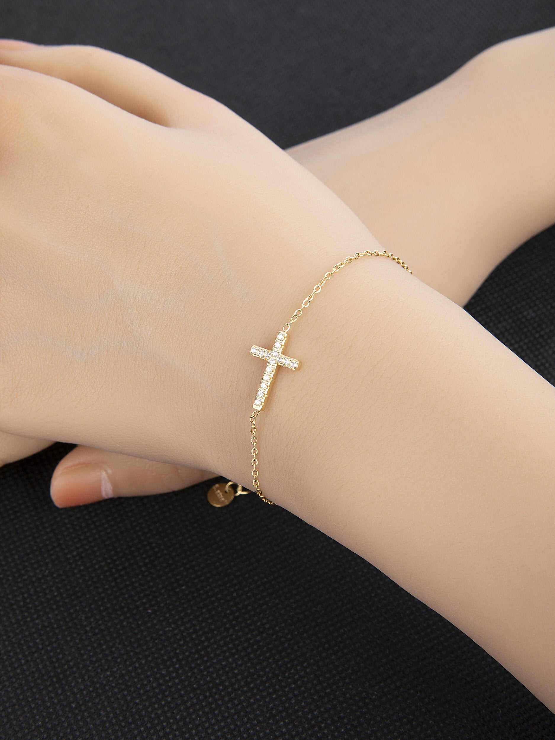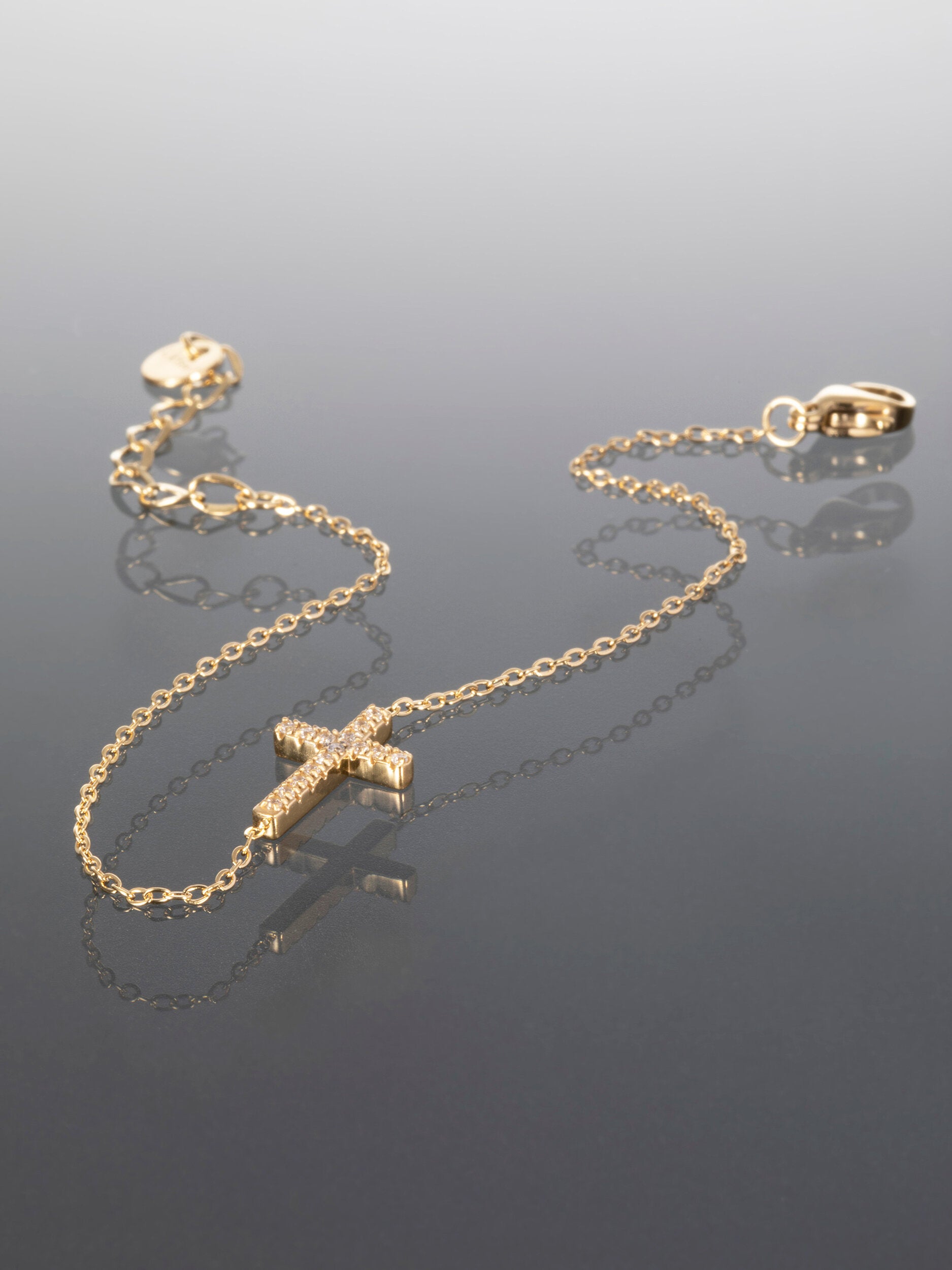 Zlatý řetízkový náramek z chirurgické oceli s jemným křížkem osázeným krystalky je moderním doplňkem vhodným ke každému outfitu. Délka náramku je nastavitelná od 17,5 do 21 cm. Zapínání na karabinku, která výborně drží a proto náramek samovolně nesklouzne ze zápěstí.
