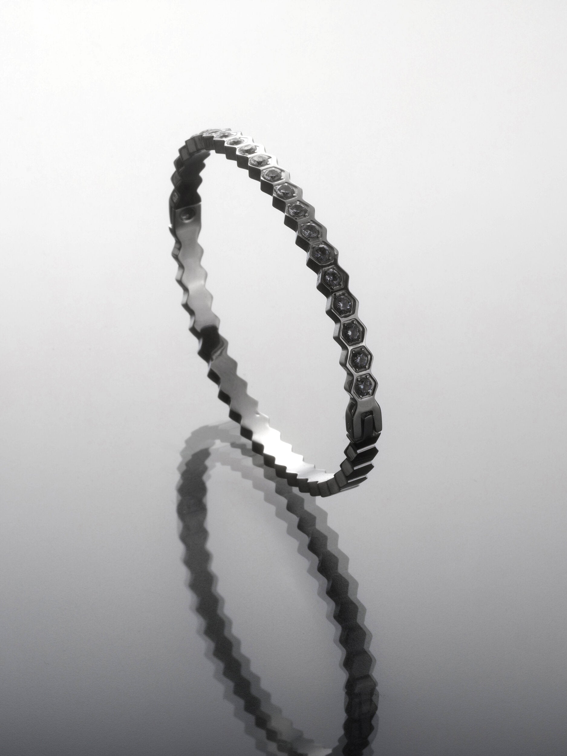 Náramek je tvořen ze dvou pevných částí, na jedné jsou umístěny třpytivé čiré krystalky, zpracování působí opravdu vkusně a nadčasově.