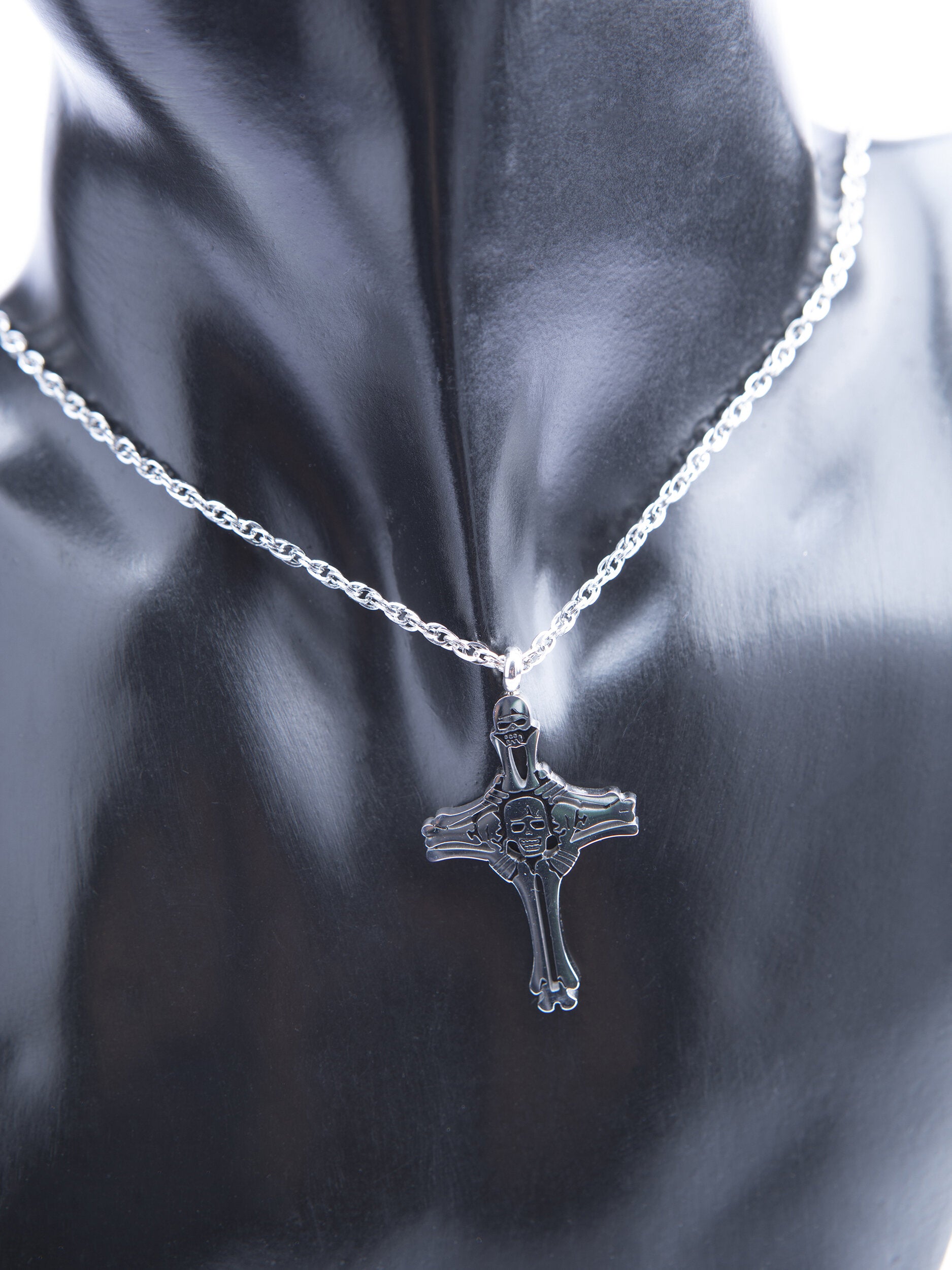 Výrazný přívěsek z leštěné chirurgické oceli, kříž s černým zdobením lebka a hnáty PK1779-0112